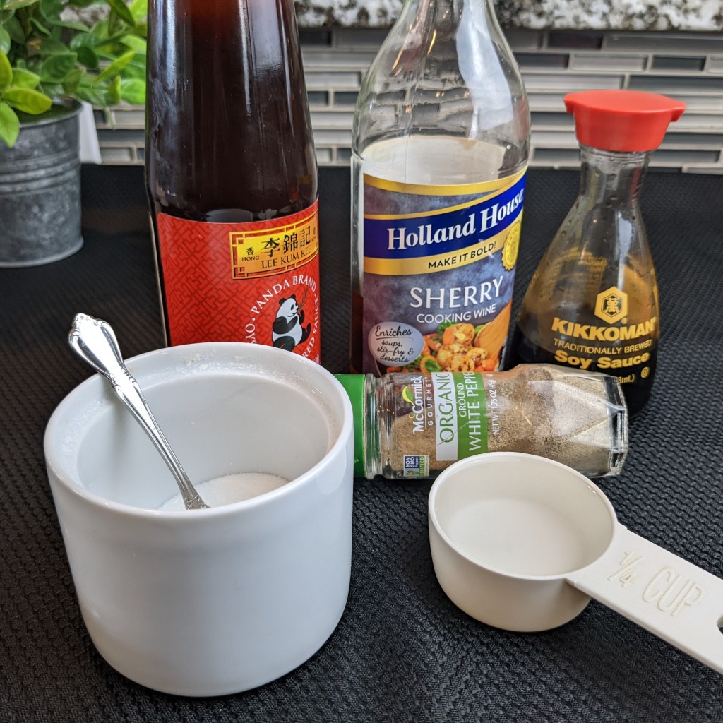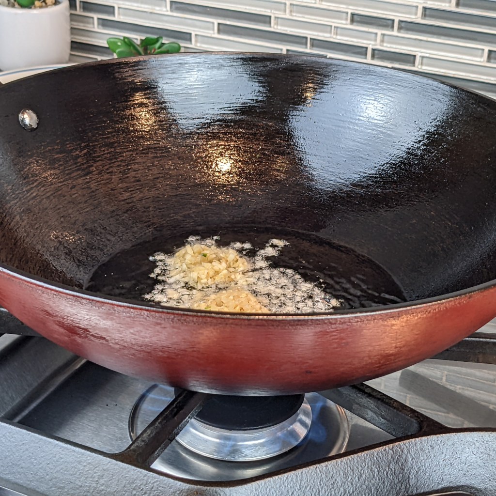 Heat oil over high heat in a large wok. Add chopped ginger and garlic, stir, and cook for 20-30 seconds, being careful not to burn the garlic. Add marinaded chicken, spread it out, for even browning. Leave the chicken undisturbed for 40-60 seconds.