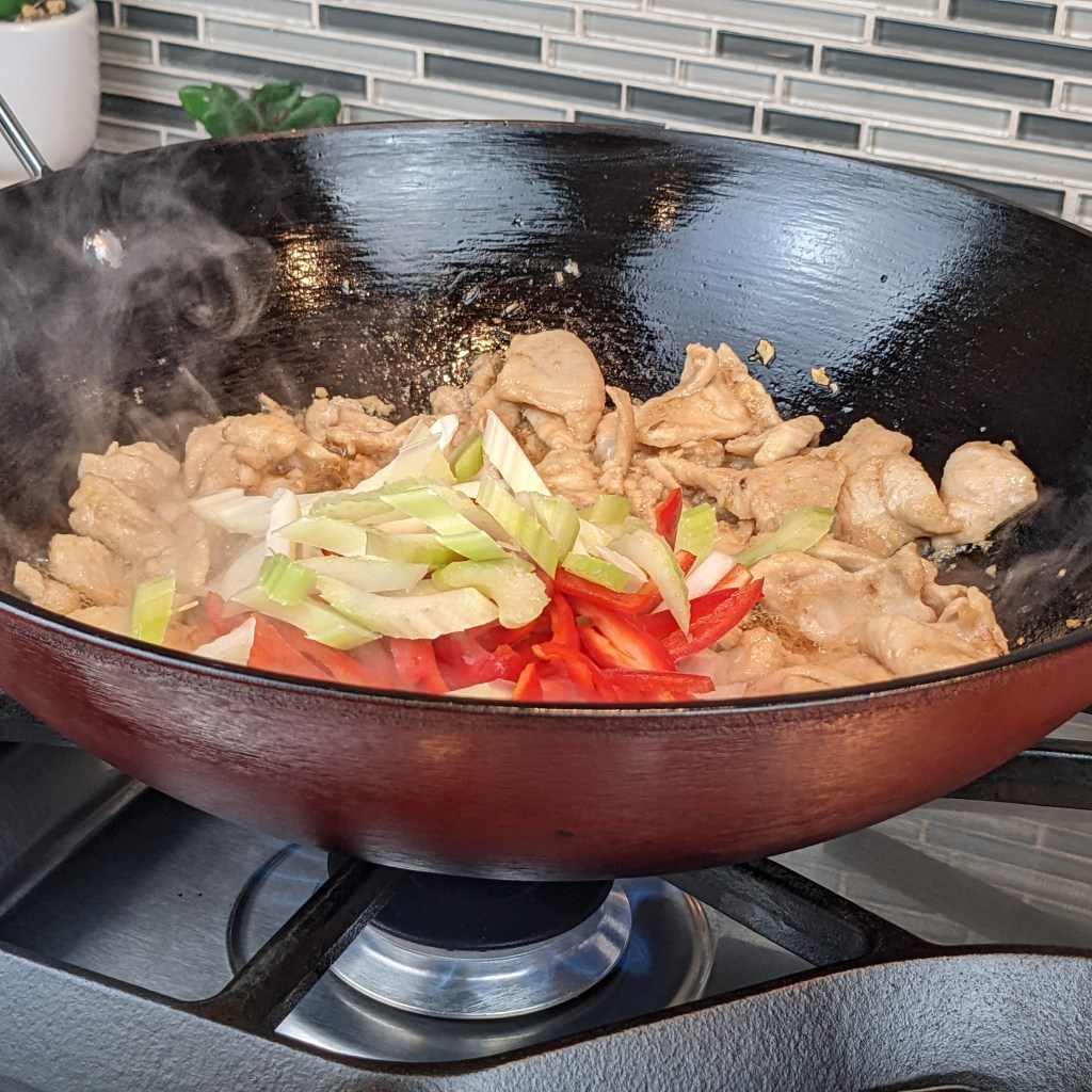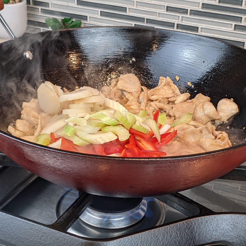 Colorful veggies make this dish beautiful. Today I selected onions, celery, bell peppers, and water chestnut. The chestnut has a nice texture and a pleasant crunch. You could also use baby corn, which is kind of like a miniature corn cob.