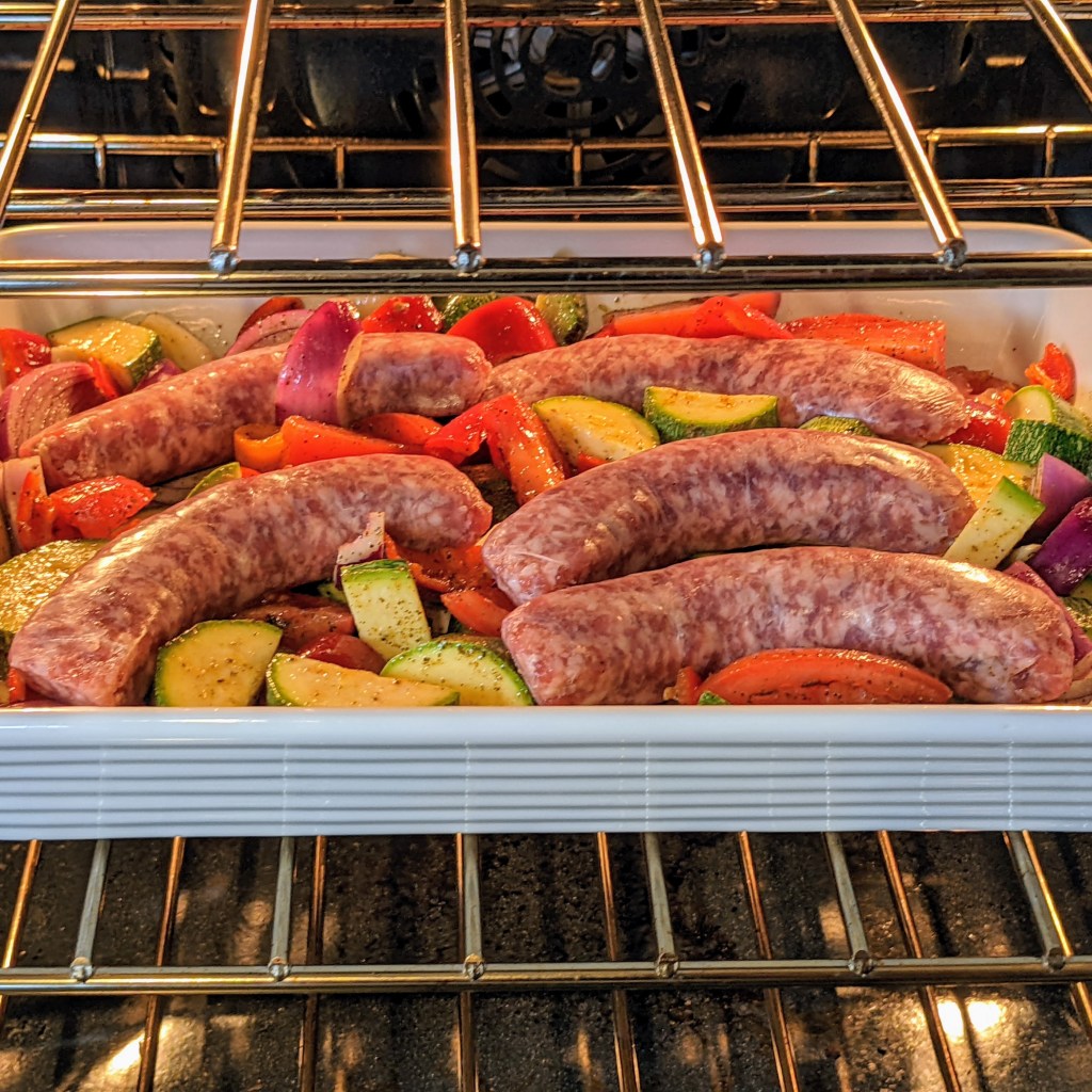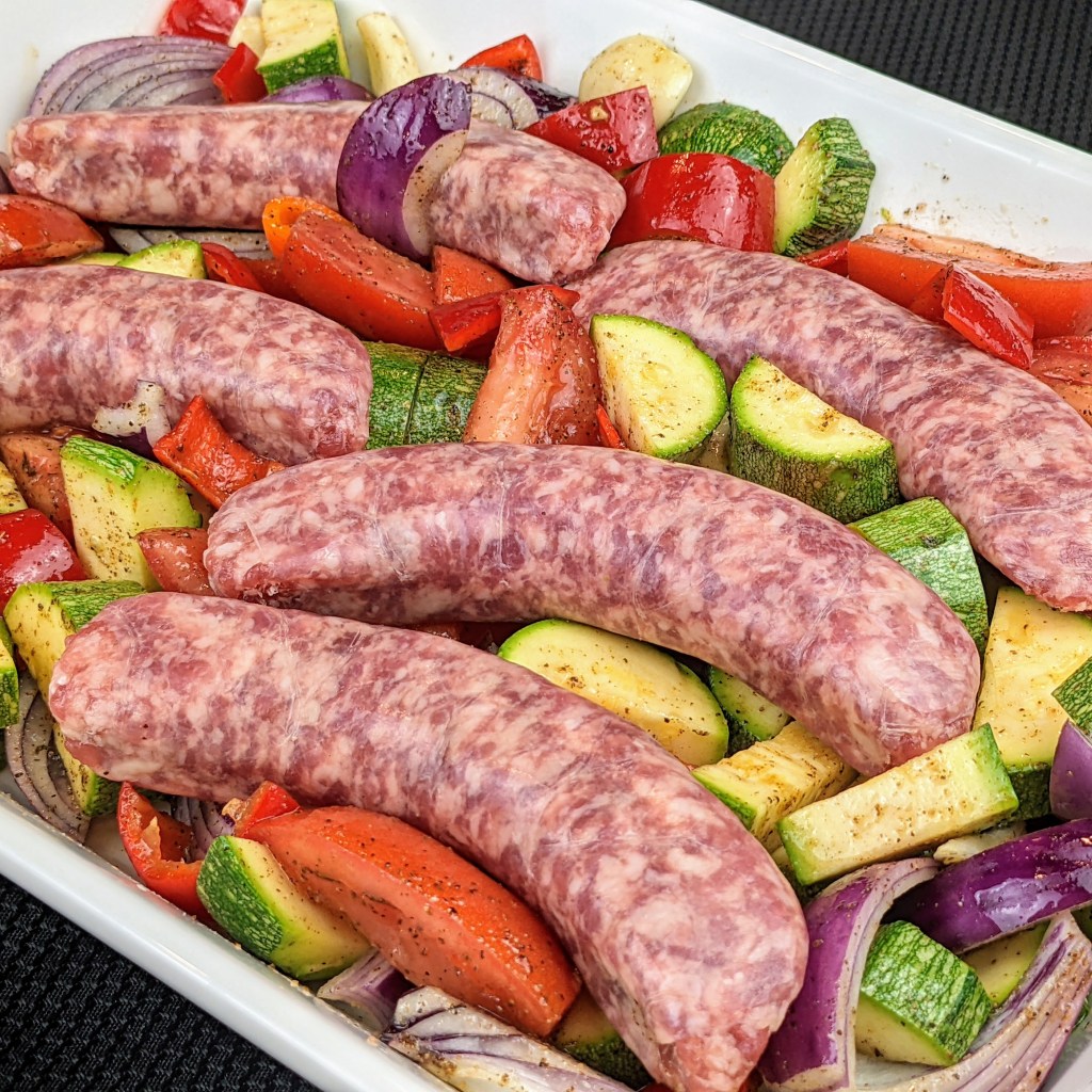 This is an easy one-pan dinner made with my favorite vegetables and hearty Irish-style garlic-flavored sausages. You can customize the veggies to your liking. I served this dish over garlic mashed potatoes.