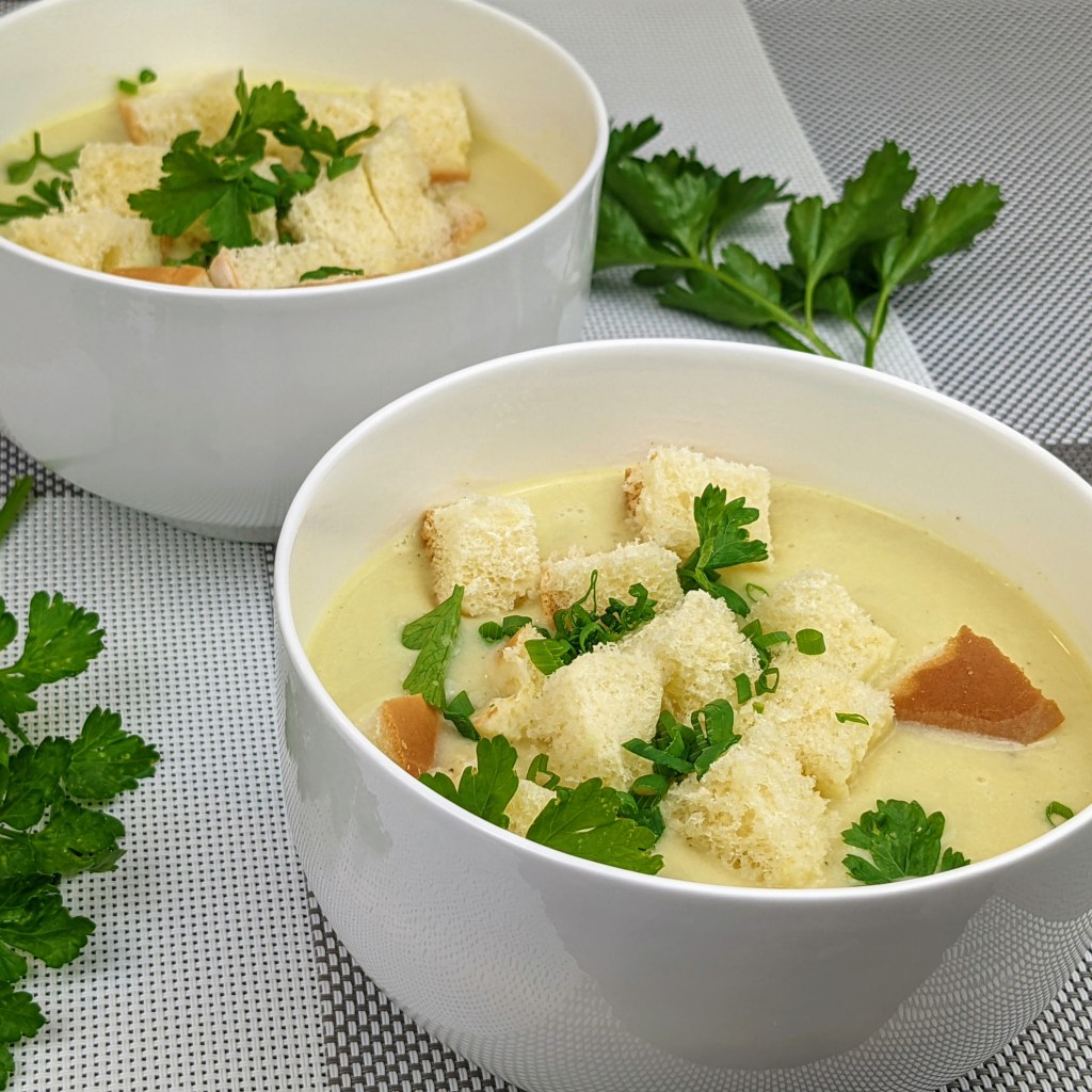 Be cautious while using hot liquids! Don’t overfill the blender. Purée until completely smooth. Taste, then garnish with cubed bread, green onion and parsley.