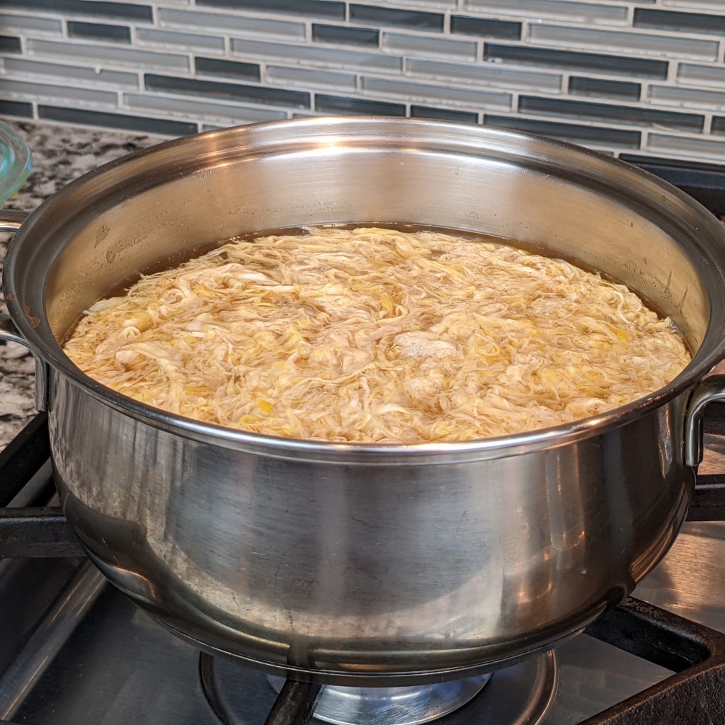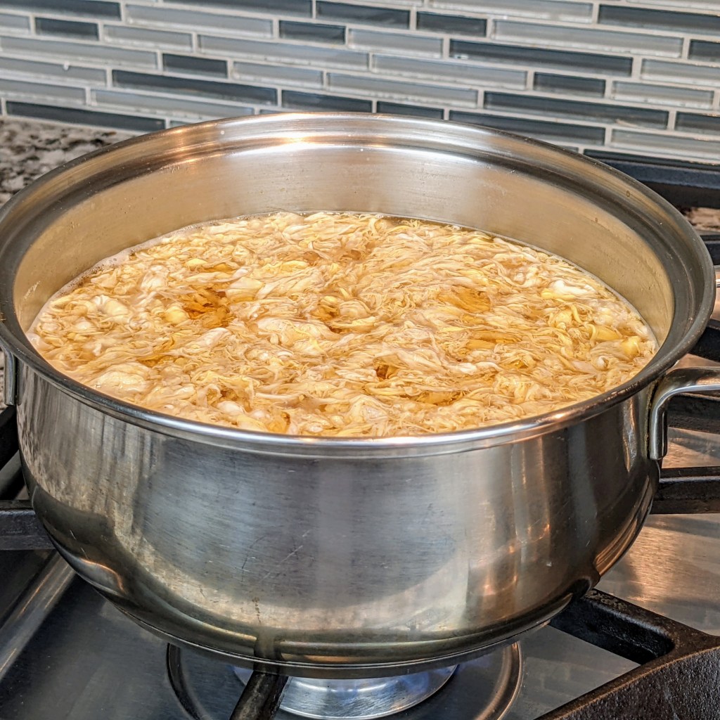 Last week I bought several rotisserie chickens for a gathering and had a lot of carcass left over so decided to make a big batch of Asian-style chicken stock. The flavor of this stock was so good that I decided to make a variety of soups like chicken and corn soup and egg drop soup.