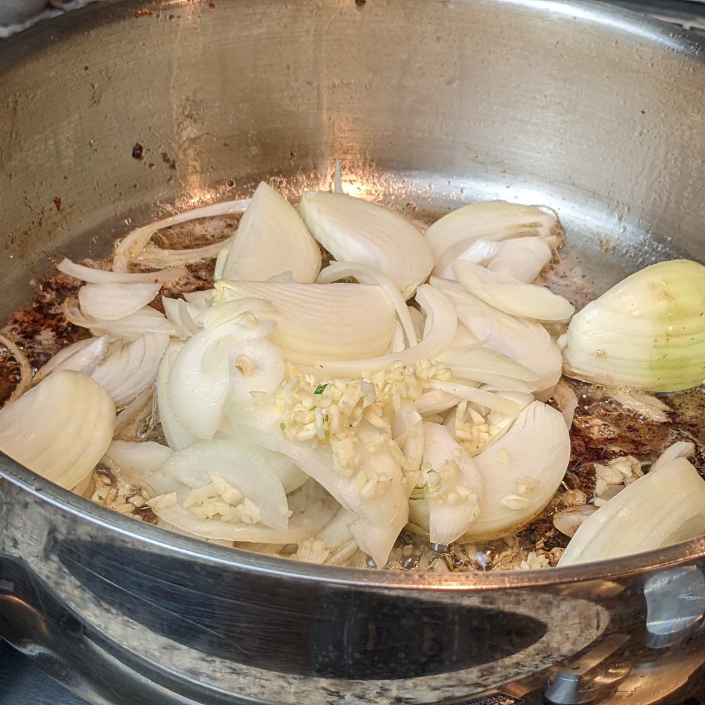 Add onions and garlic to pan, cook until onions are soft, about 3 to 5 minutes. Adjust the heat if onions are browning to fast.
