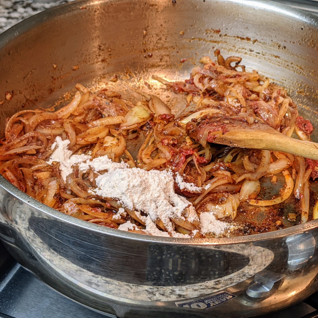 Add 1 tablespoon of reserved flour, stir well, then cook for a minute.