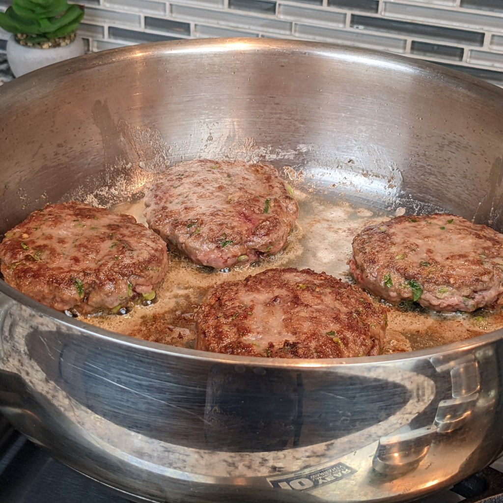 Heat butter in a heavy bottom sauce pan over medium-high heat. Add patties, and cook for about 3 minutes. Turn the heat down to medium then flip the patties and cook for 2 minutes. Remove the patties to a plate.