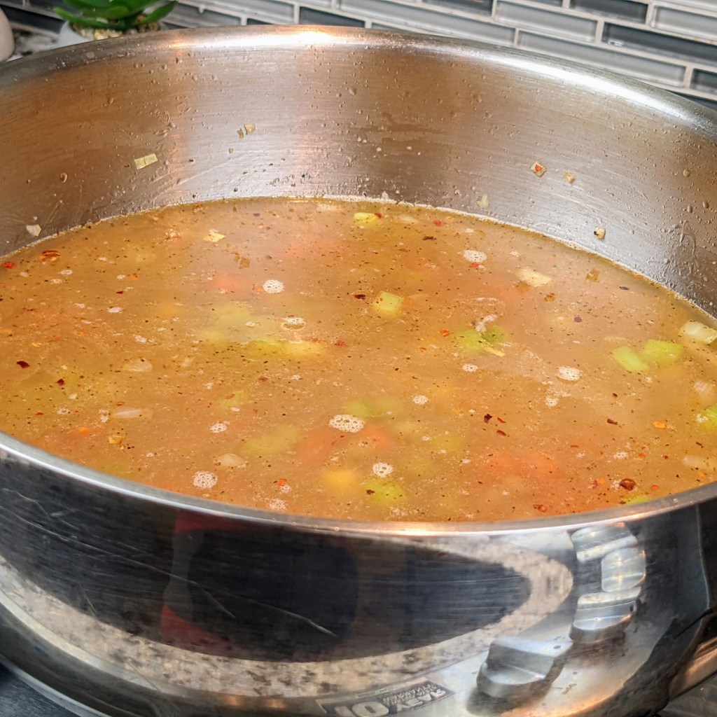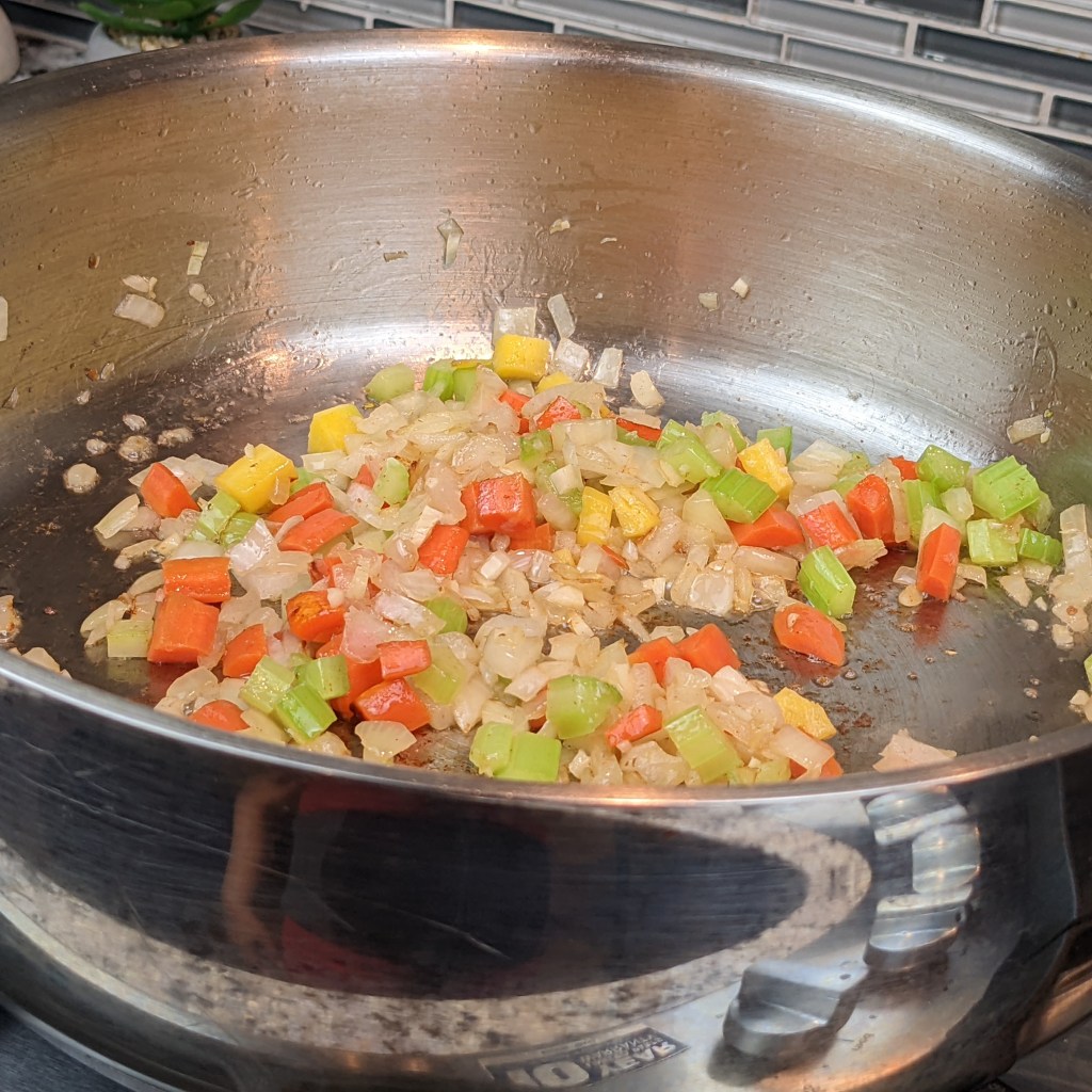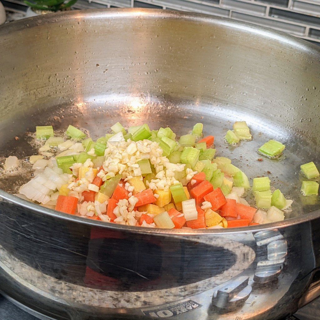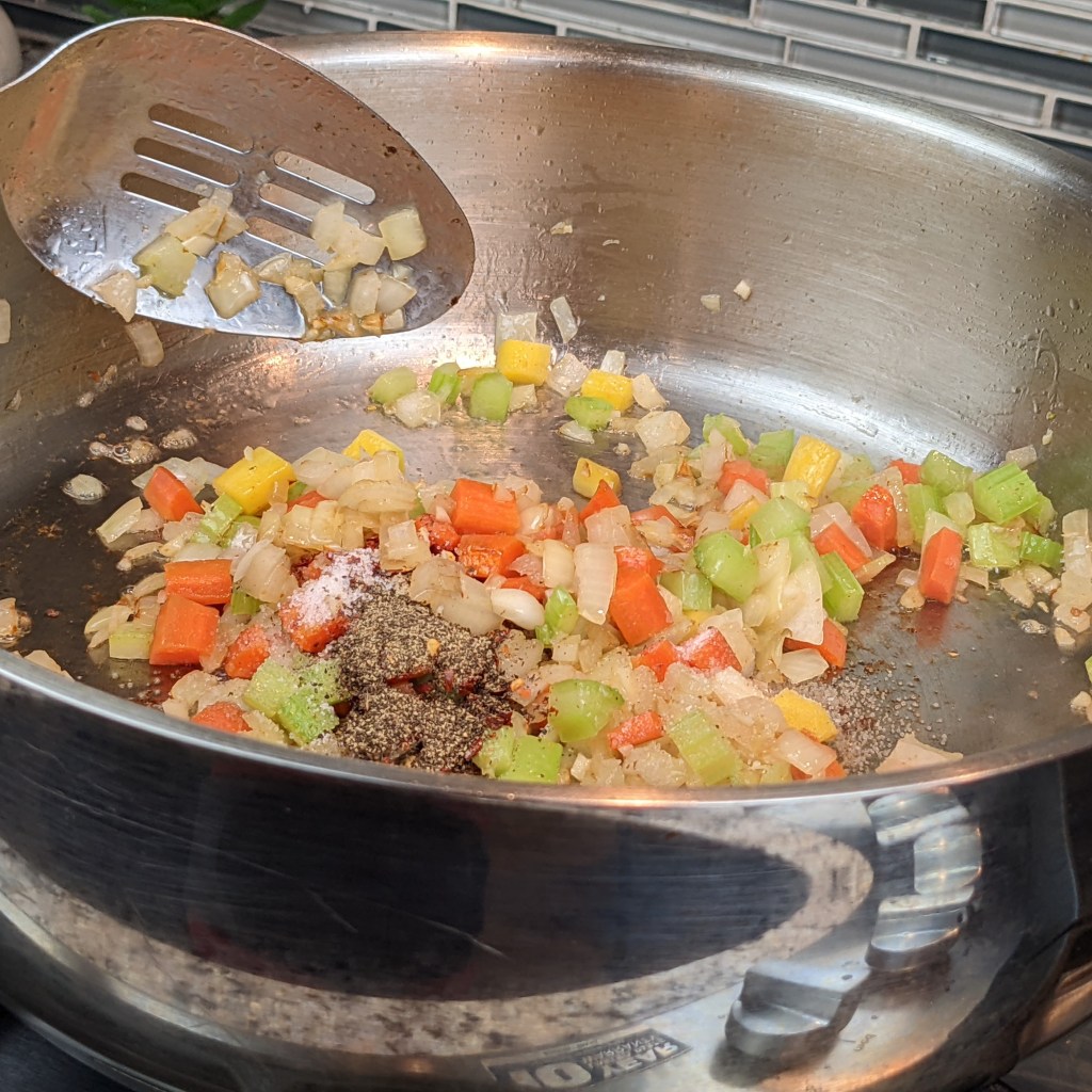 Add onion, celery, carrots, and garlic to the bacon fat. Cook for 3-5 minutes, stirring in between. Add chili flakes, salt, and pepper. Stir the veggies mixture well.