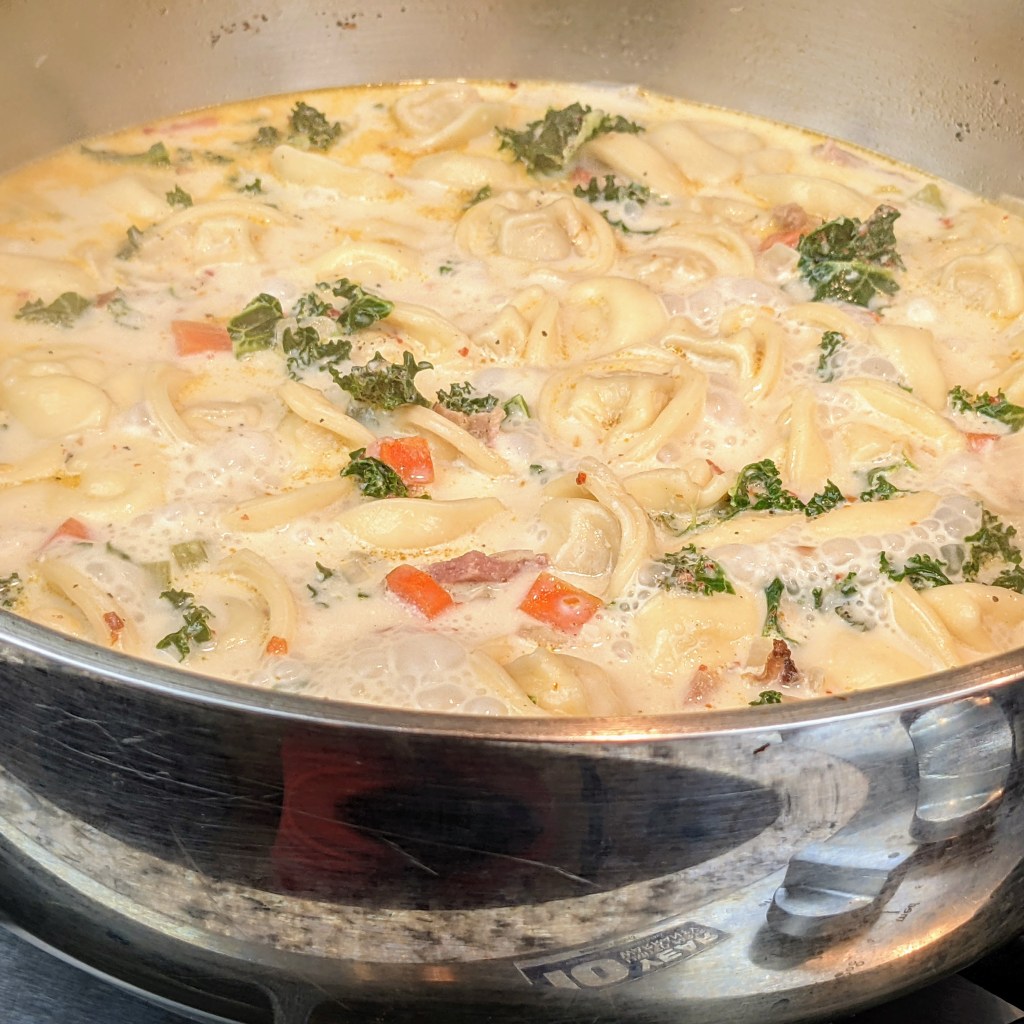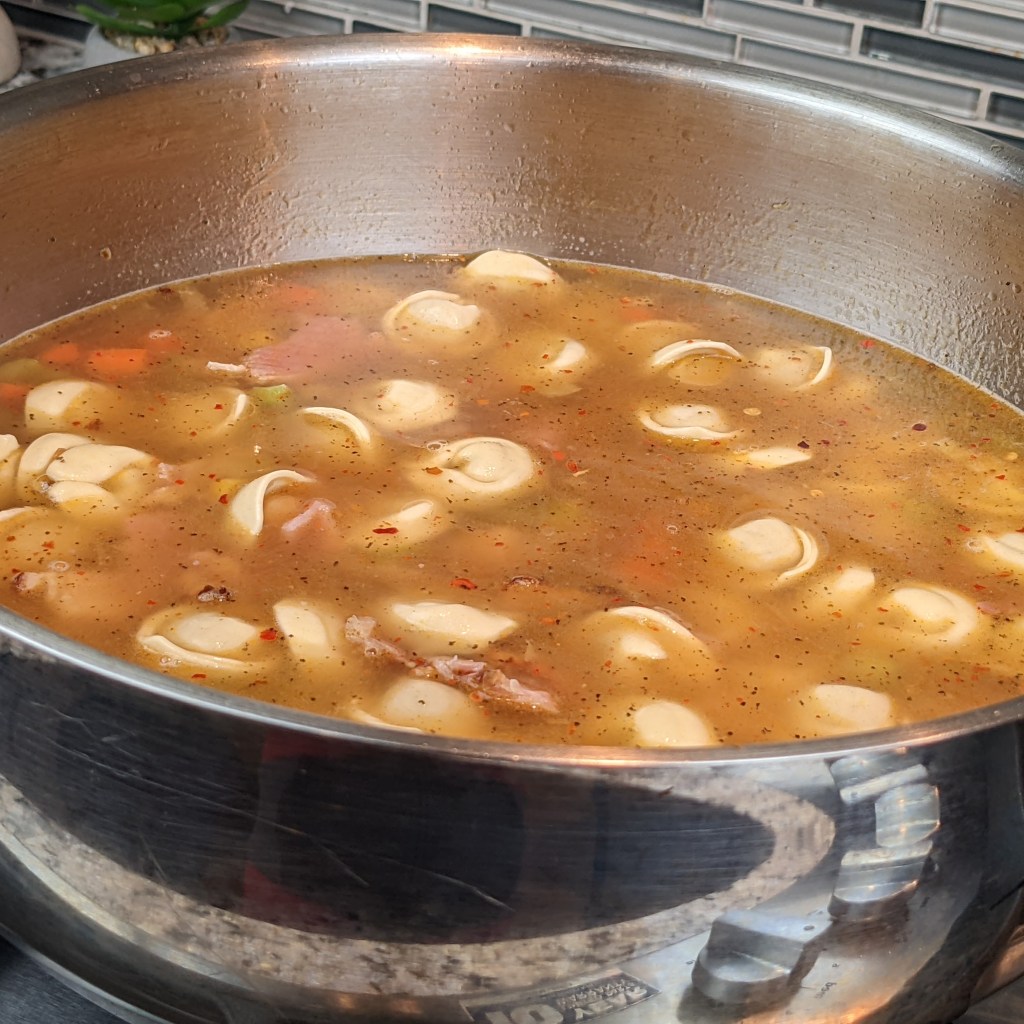 Cook for a minute. Add chicken stock, tortellini, and ham. Stir well, then cover and cook for 10 minutes. Adjust the heat in-between if needed.