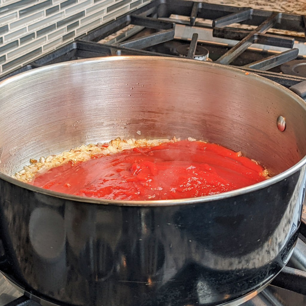 Heat a large heavy bottom sauce pan over medium heat. Add oil. When the oil is hot add onions, cook onions until soft for about 3-5 minutes.