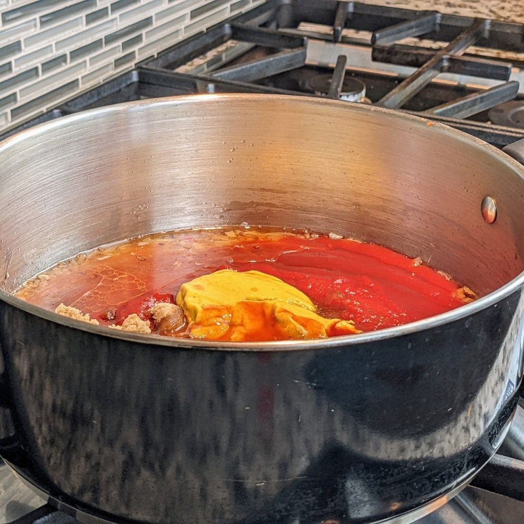 The first thing I do make is make the BBQ sauce. Ingredients include ketchup, mustard, sugar, vinegar, and a few other ingredients which you might have in your pantry or refrigerator. There is one other secret ingredient I use to give an extra punch of flavor: liquid smoke. This adds a slight smoky flavor to the sauce. You can find this in most big grocery stores or online.
