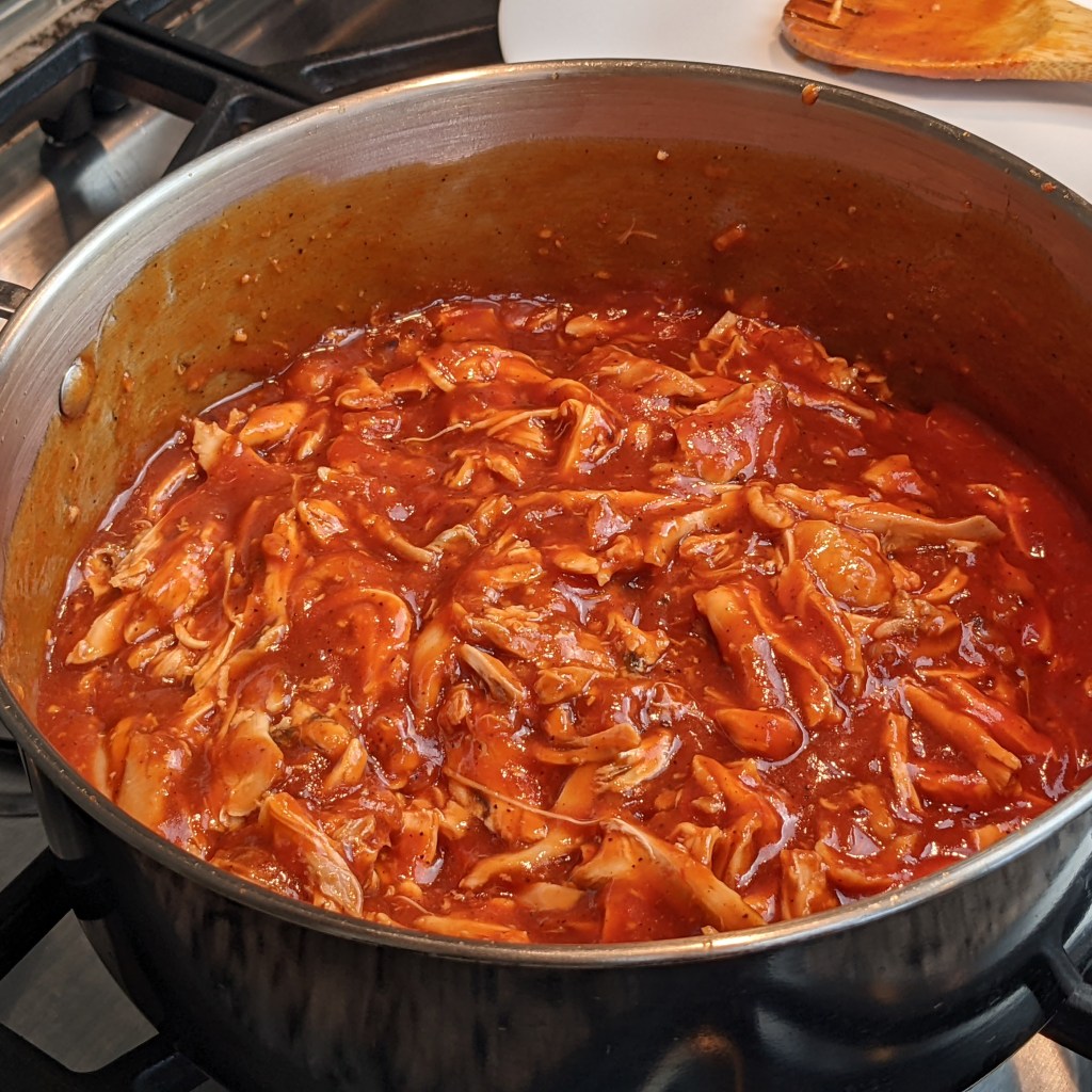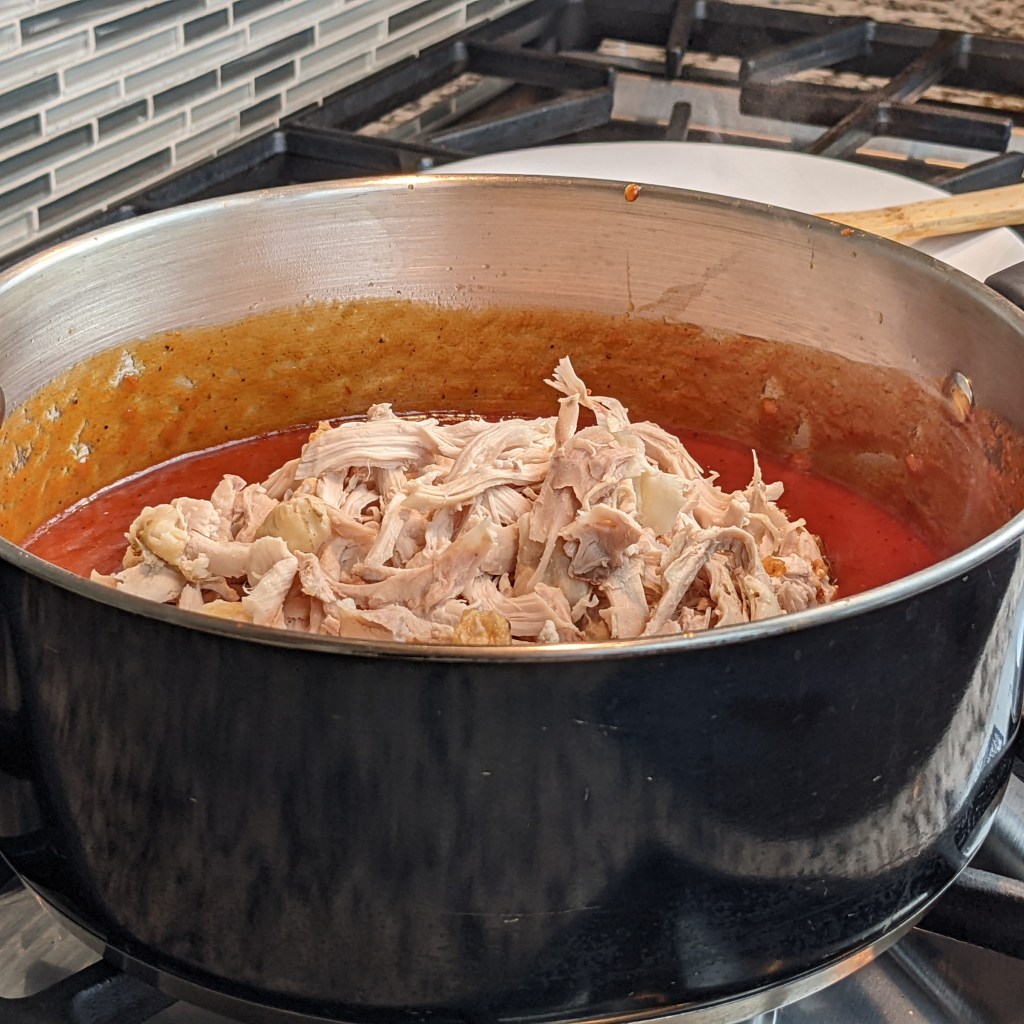 Add shredded chicken, stir well, then simmer for 3-5 minutes or until chicken is warmed through.