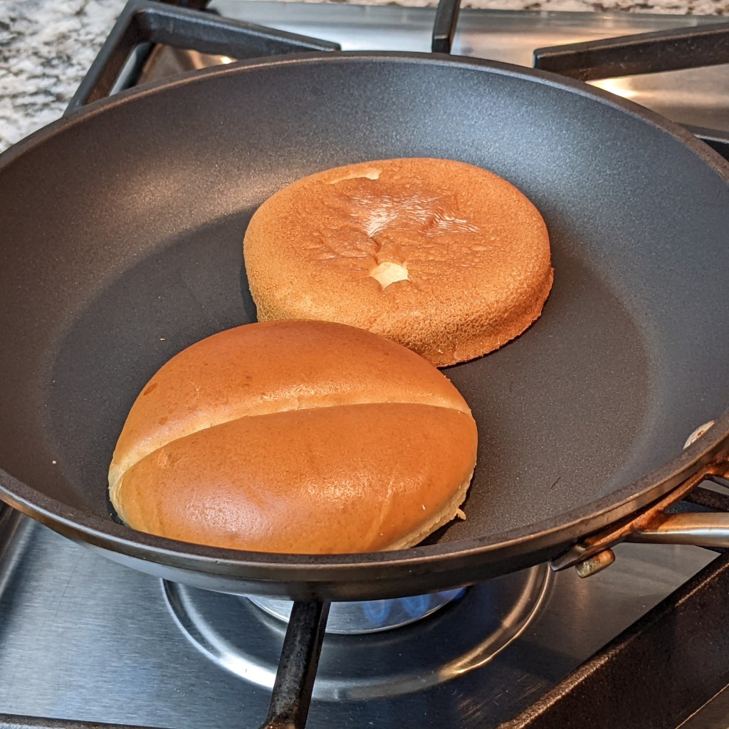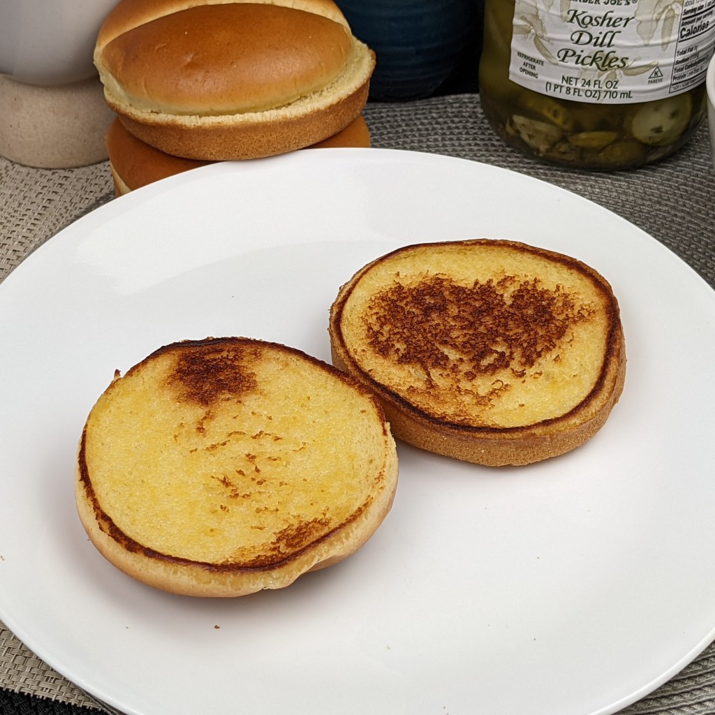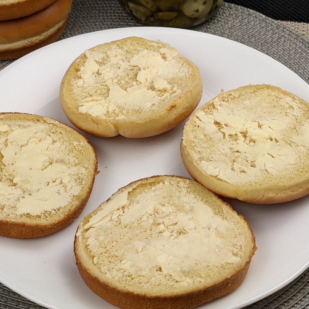 Butter hamburger buns, then toast the butter side of the buns until golden brown.
