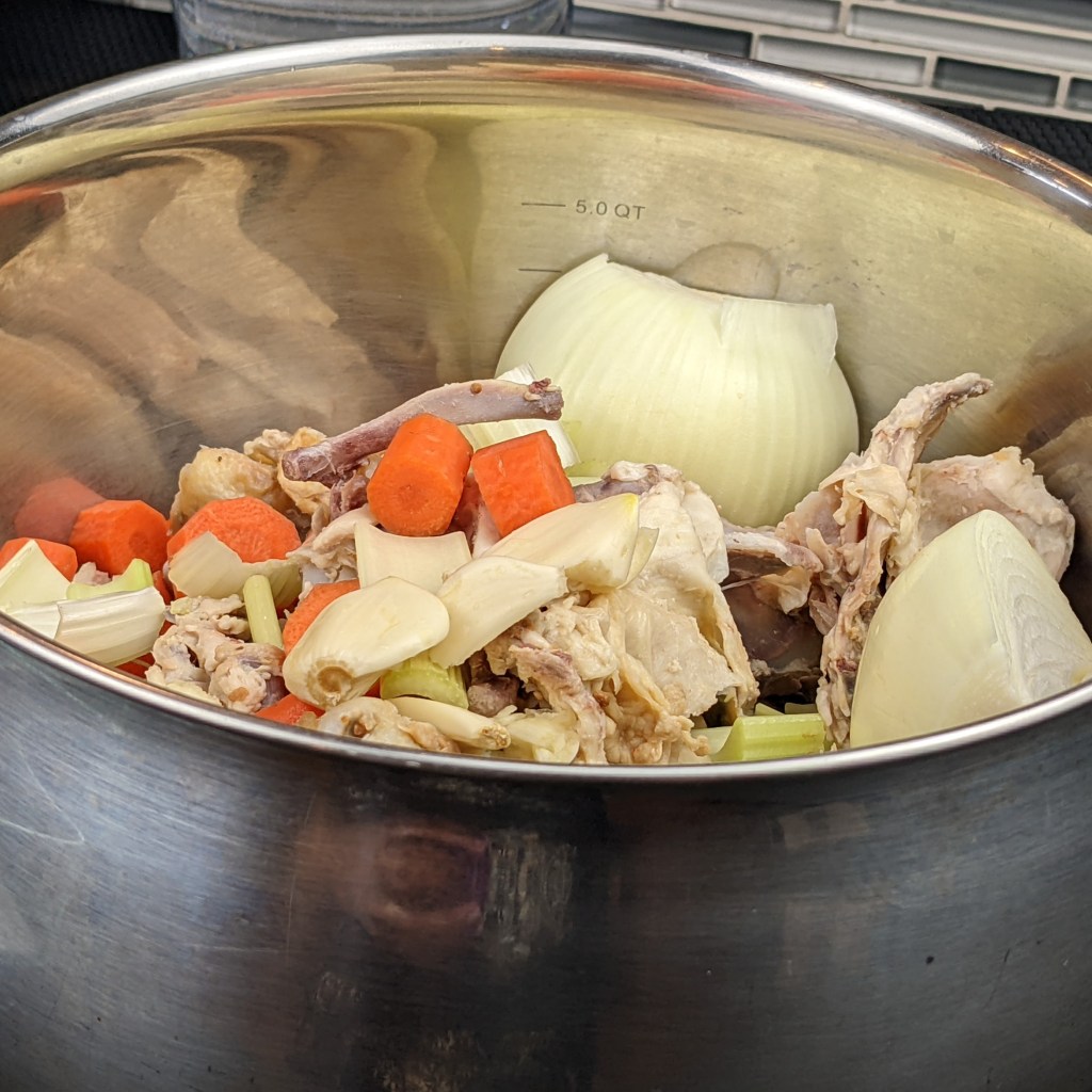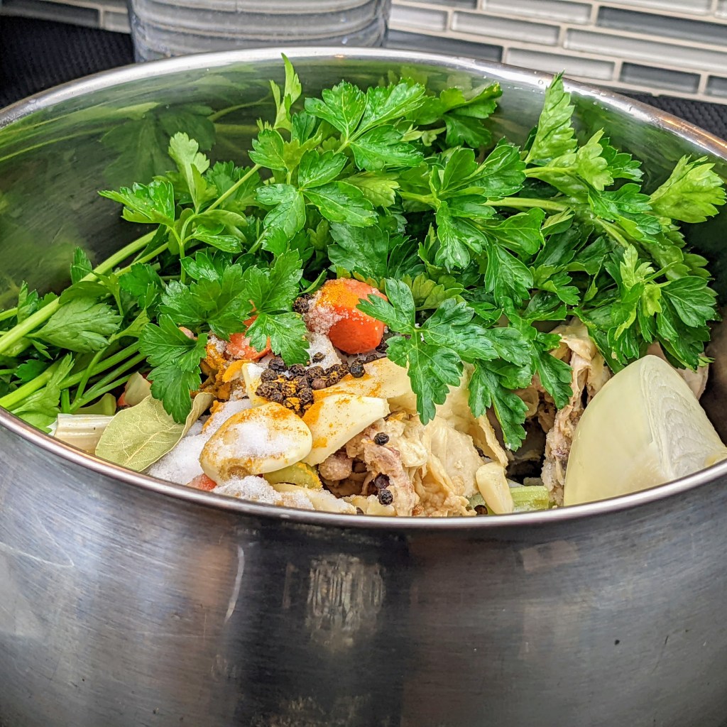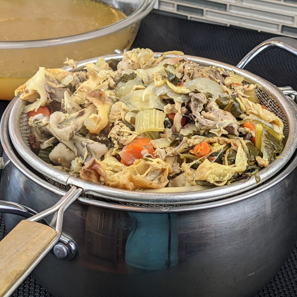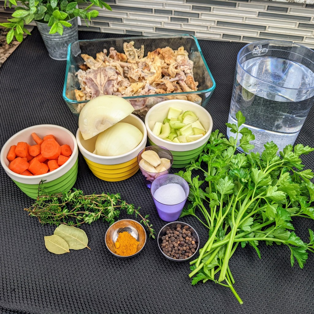 I am using leftover cooked chicken carcass, a few aromatics, and herbs to make this recipe. I then simmer the soup for couple of hours. Once it is cool enough to handle I strain the stock, discard the solids, and use the stock to make variety of dishes.