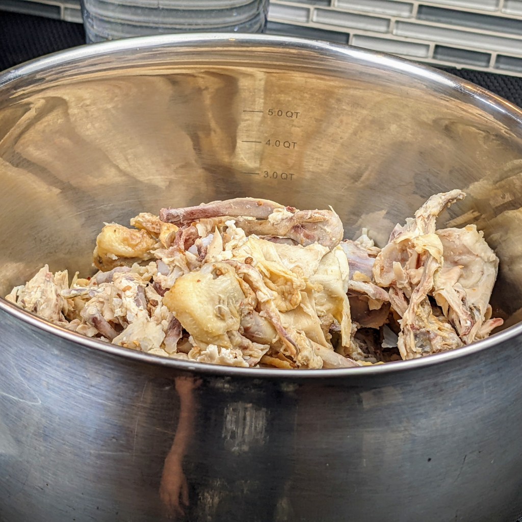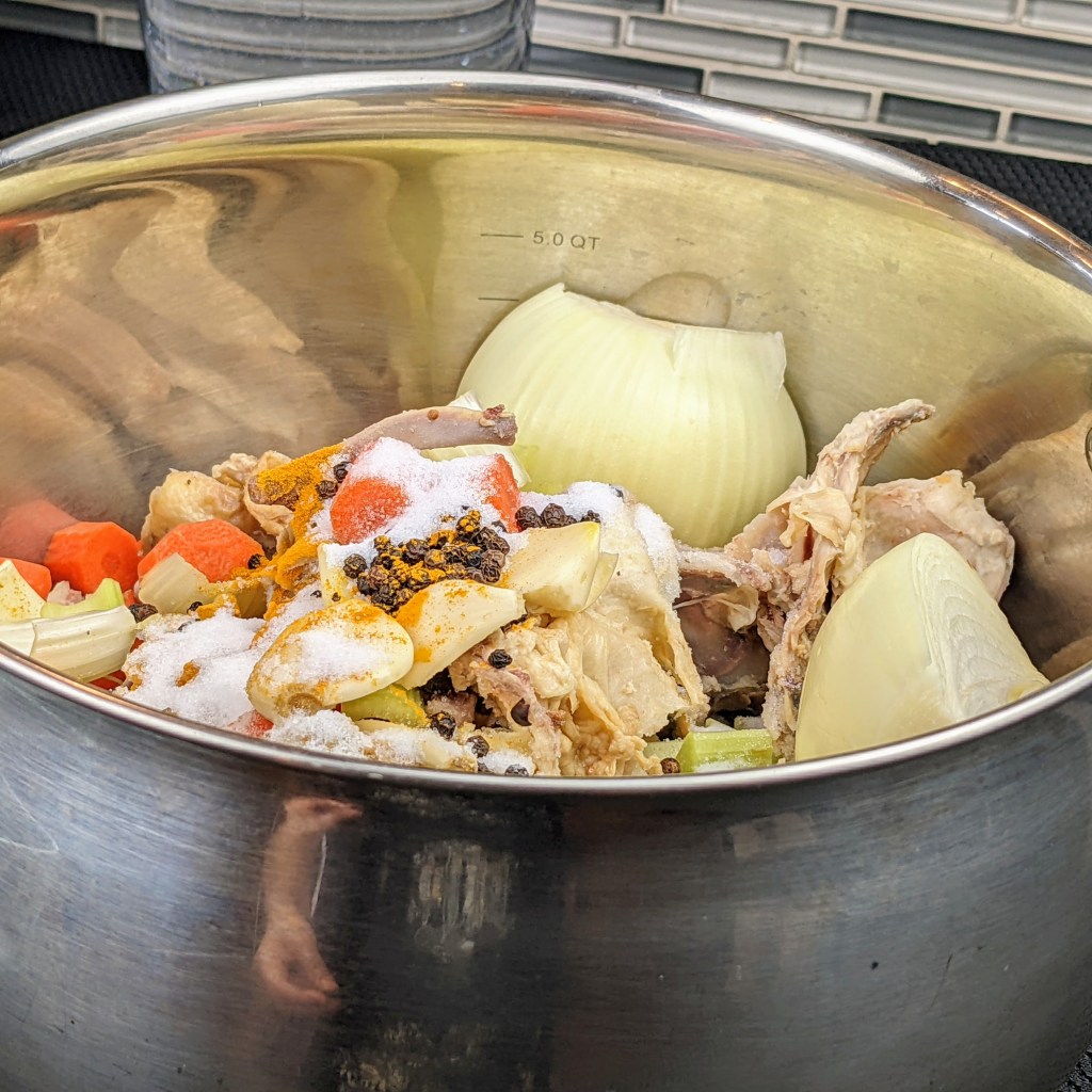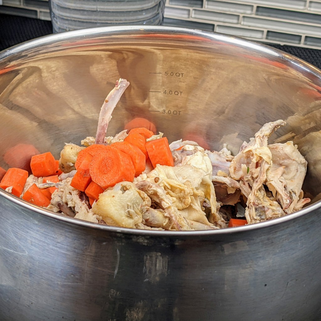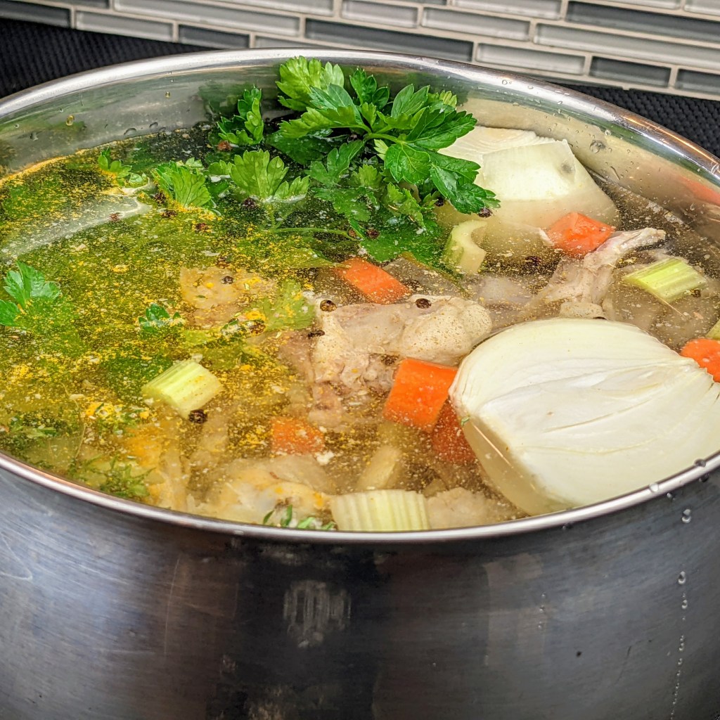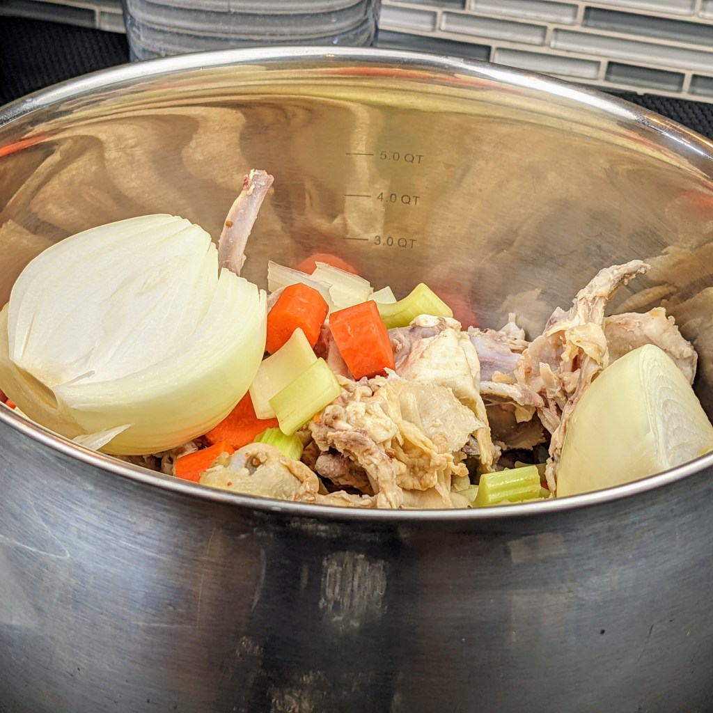 I am using leftover cooked chicken carcass, a few aromatics, and herbs to make this recipe. I then simmer the soup for couple of hours. Once it is cool enough to handle I strain the stock, discard the solids, and use the stock to make variety of dishes.