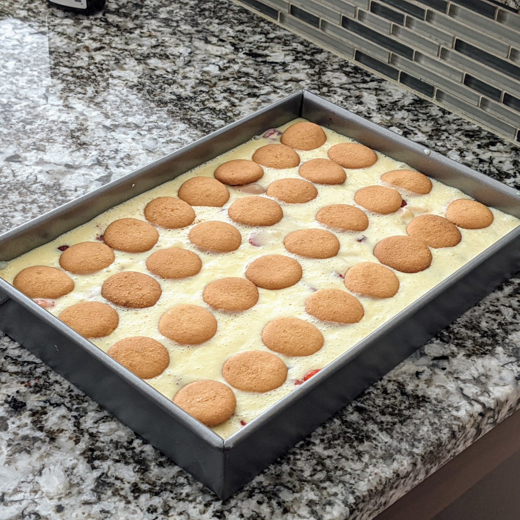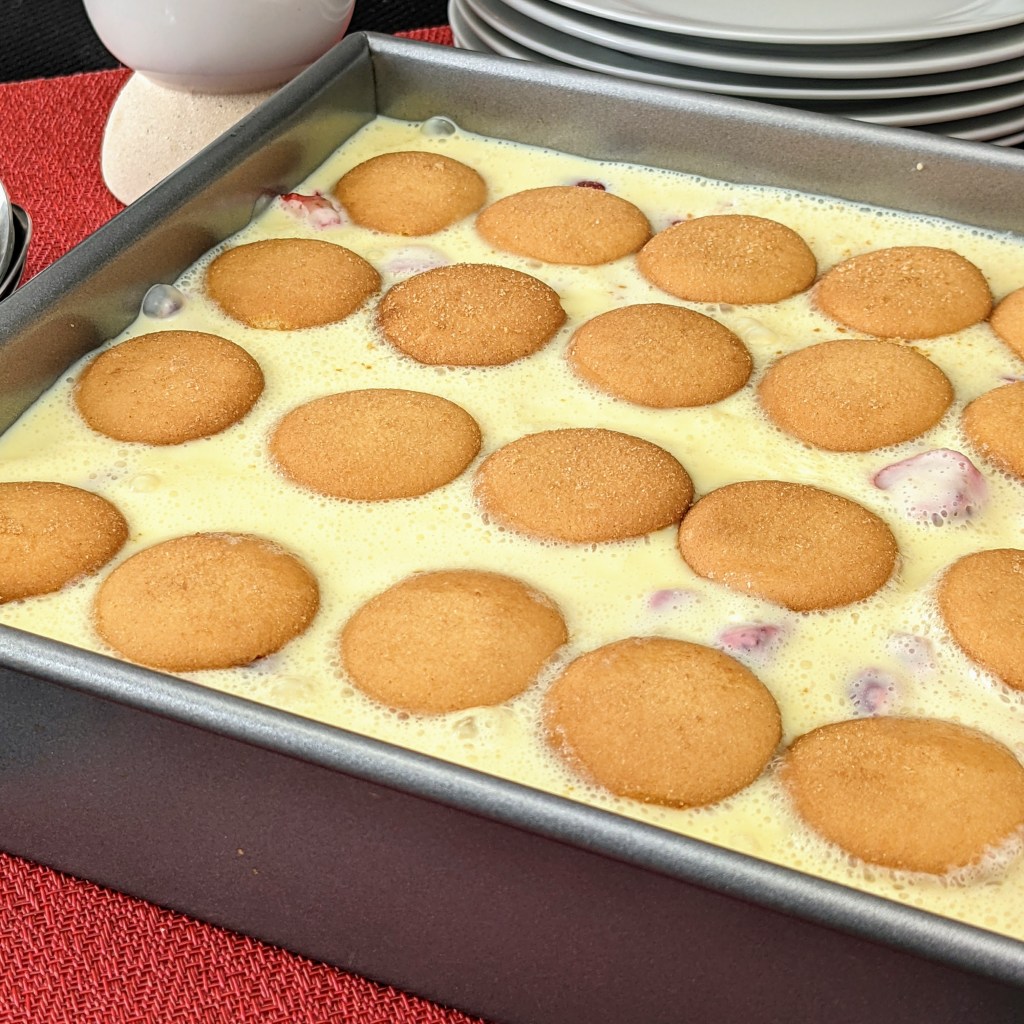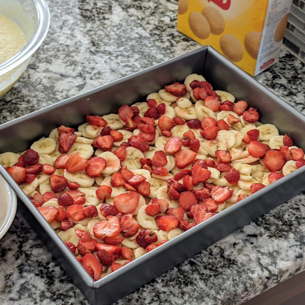 Line the bottom of a 9X13-inch baking dish with half the vanilla wafer. Top with sliced bananas, followed by sliced strawberries.