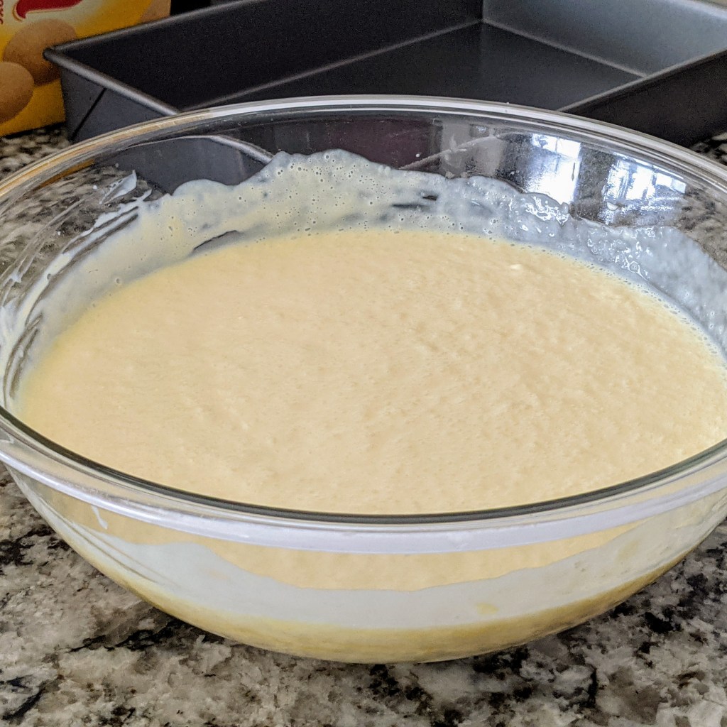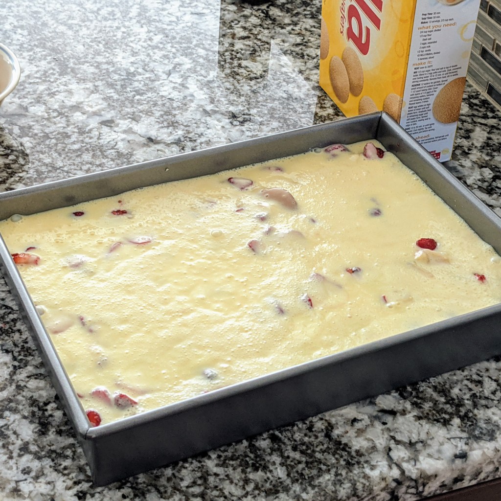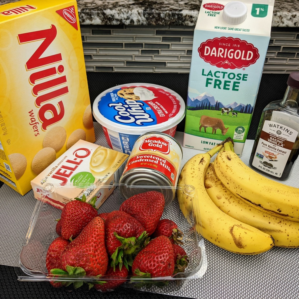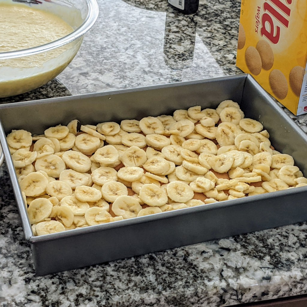 Line the bottom of a 9X13-inch baking dish with half the vanilla wafer. Top with sliced bananas, followed by sliced strawberries.