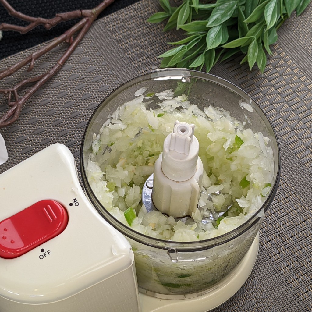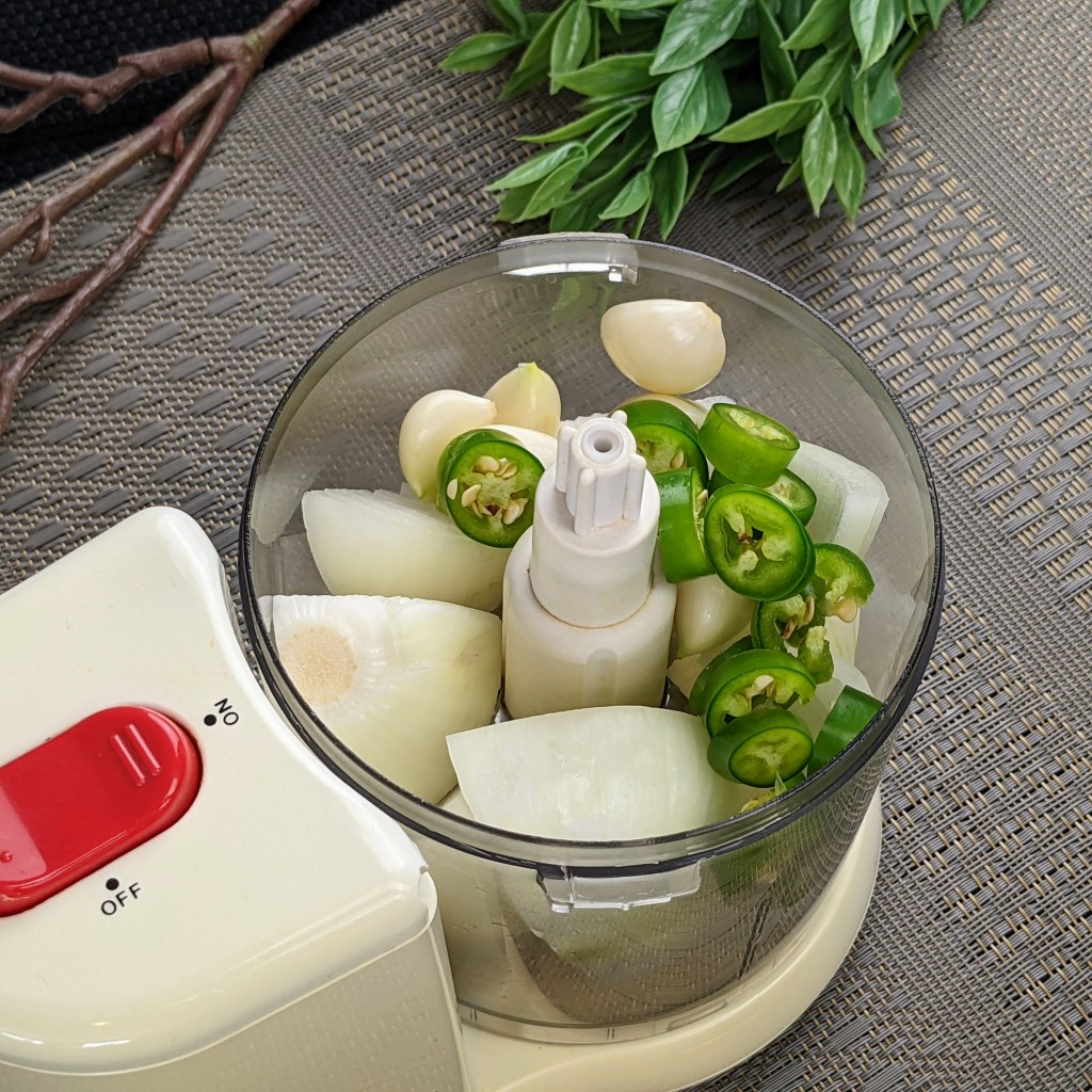 Place 1 cup onion, garlic, and serrano chili in a food processor. Coarsely chop the veggies. Then, place the mixture in a medium sized bowl.