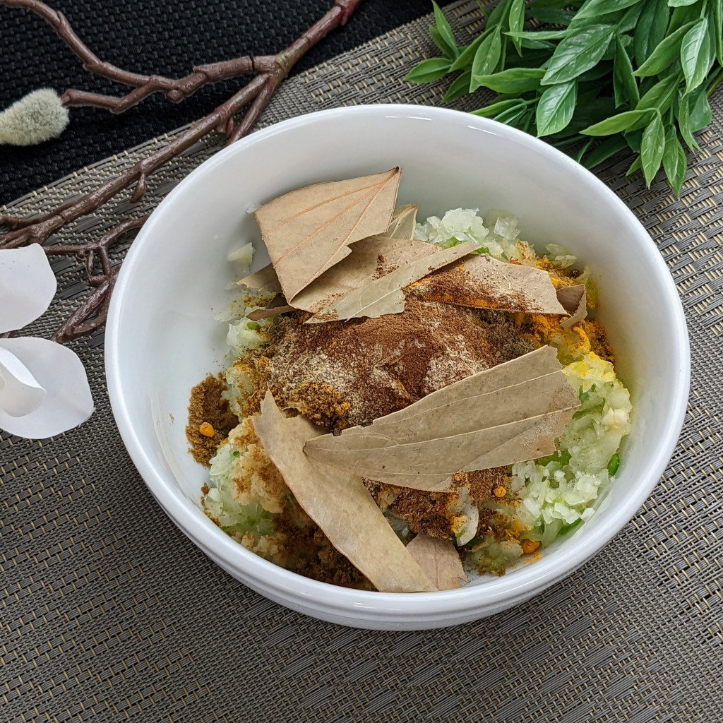 Add ginger, red Indian chili powder, ground coriander, ground cumin, ground turmeric, cinnamon powder, cardamom powder, ground cloves and cinnamon leaves to the mixture. Mix everything well together and set aside until needed.