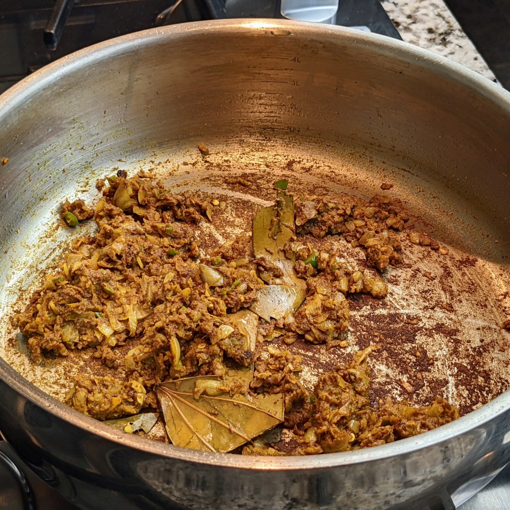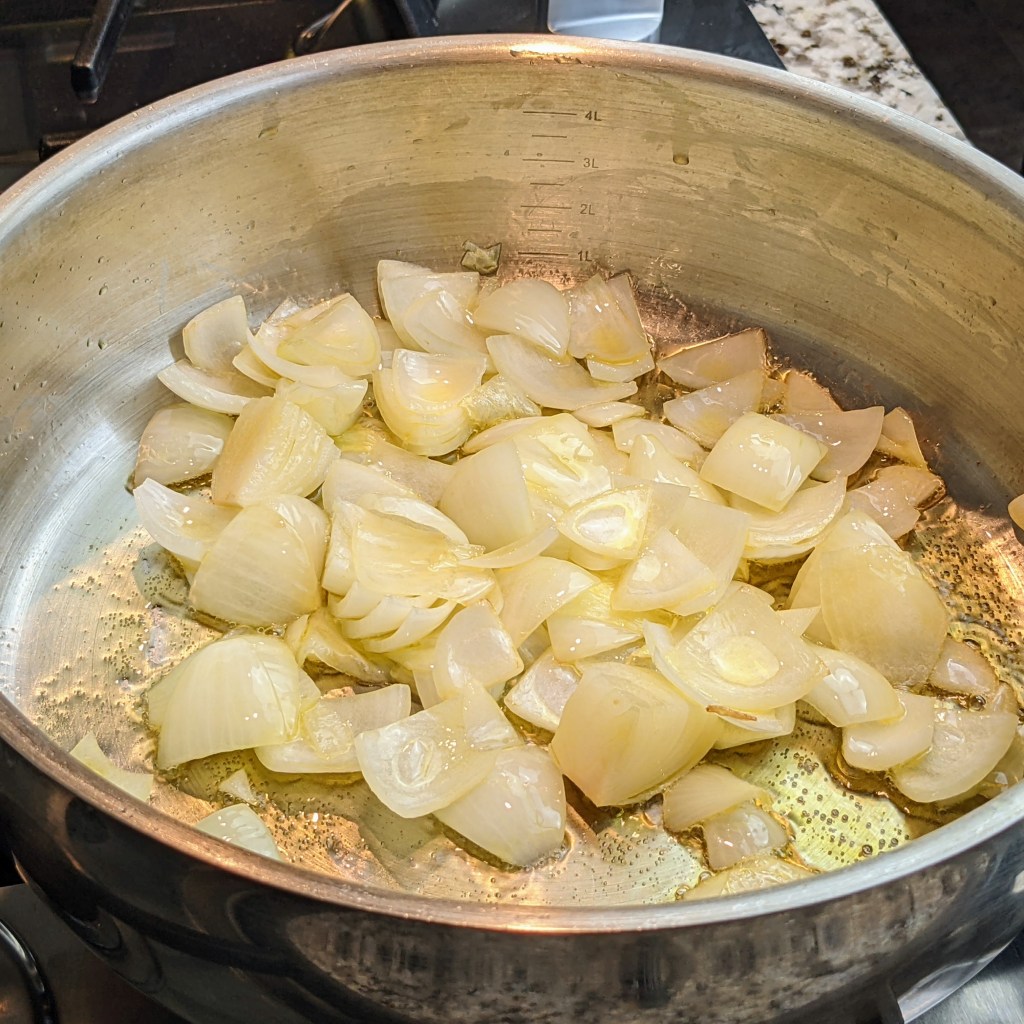 I fry my first batch of onions in ghee for two minutes then set them aside. I add them in at the end of the cooking time. This process keeps the onion whole and adds a slight pleasant texture to the curry.