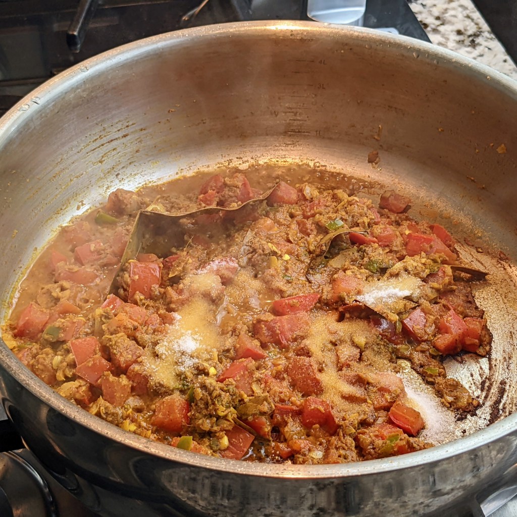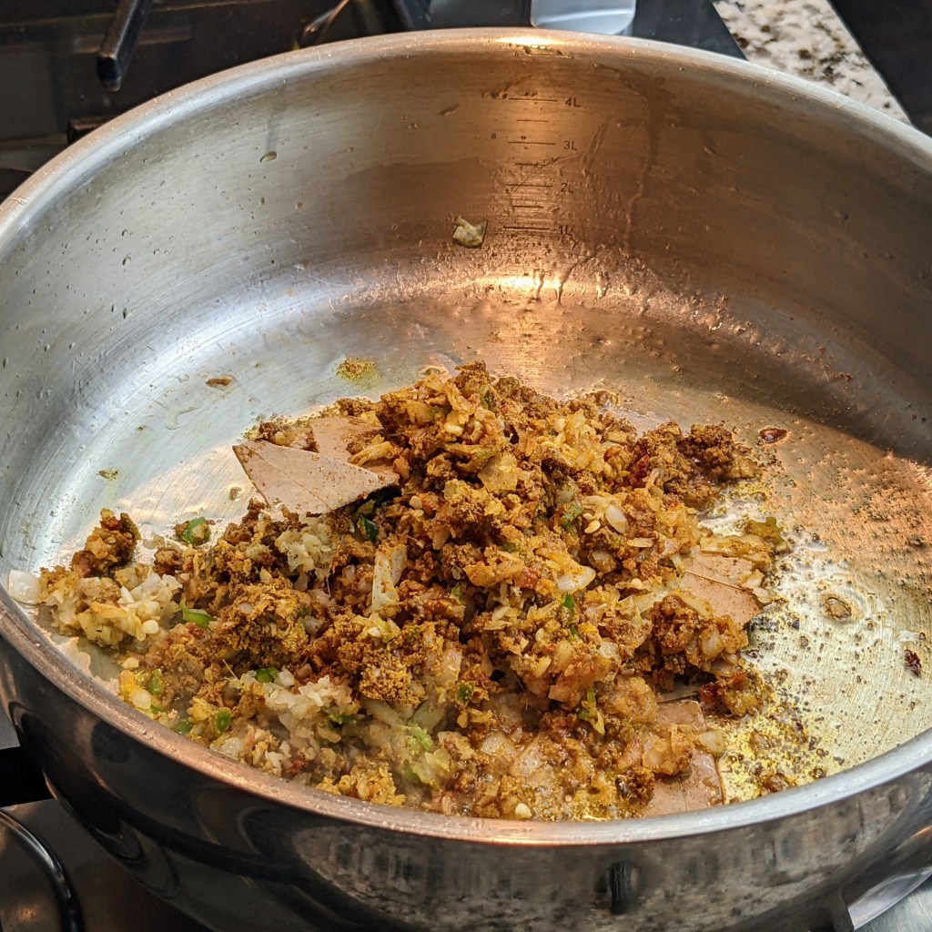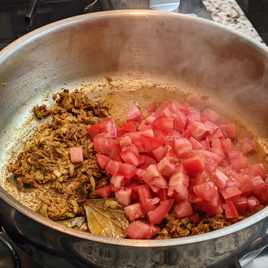 Turn down the heat to low and add the prepared spice mixture to the ghee. Stir well, then cook for 2-3 minutes or until color darkens. Keep an eye and stir often so the mixture doesn’t burn. Add chopped tomatoes.