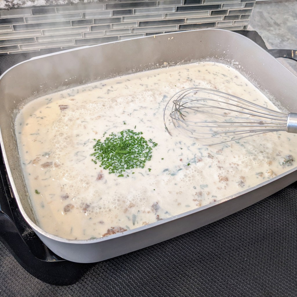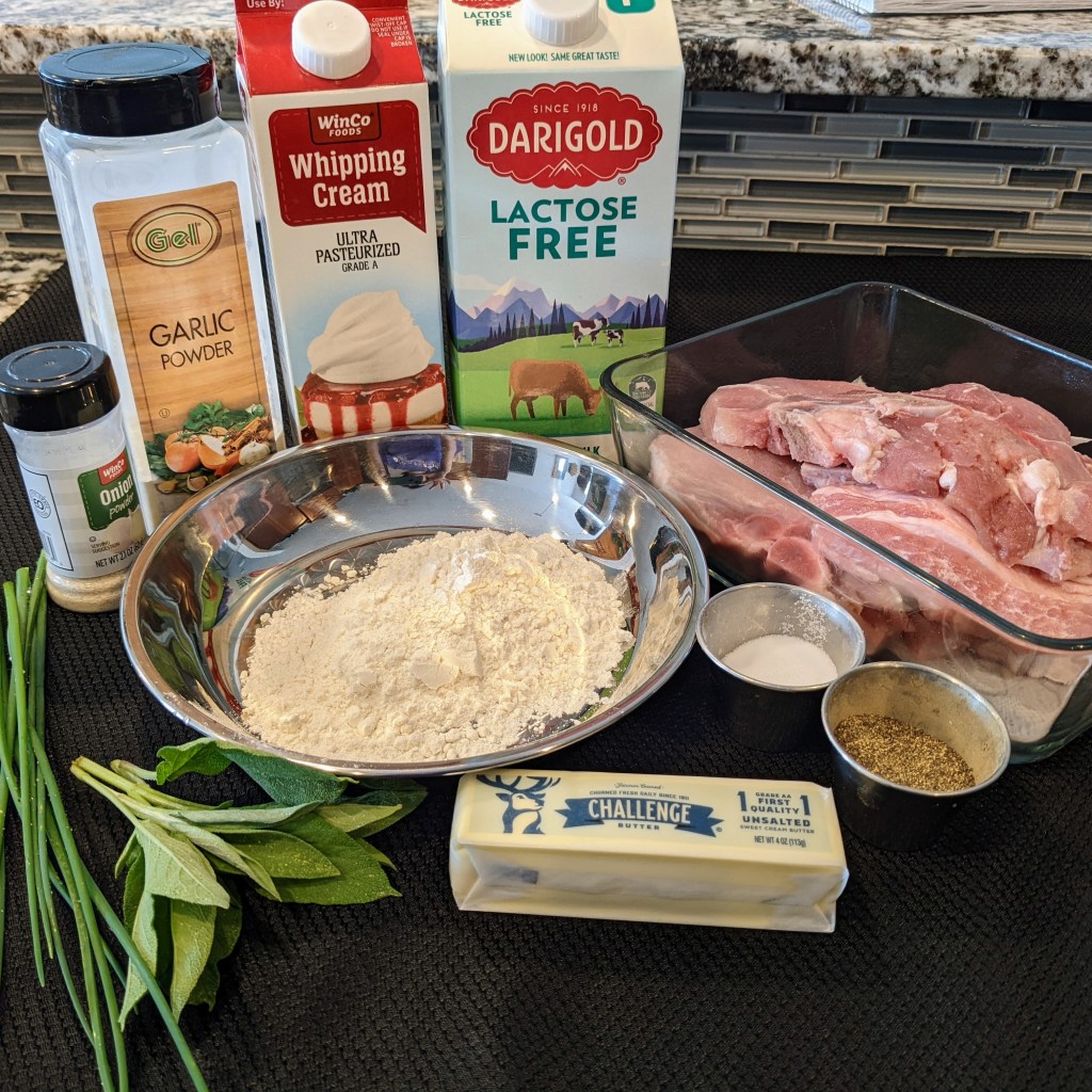 Stir in sage and chives. Taste for seasoning. Add the pork back into the gravy to warm up. This dish goes very well over mashed potatoes. Another option would be roasted potatoes and sauteed veggies.