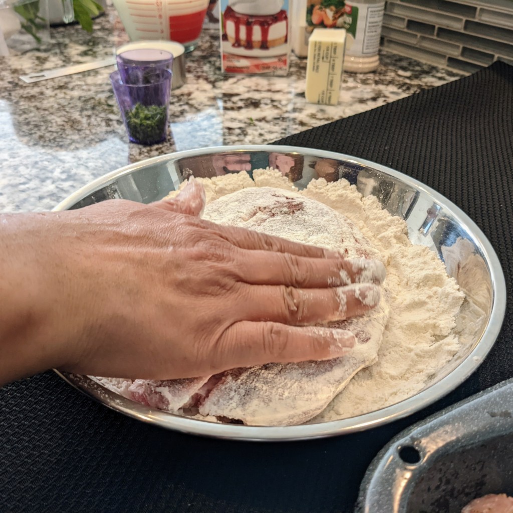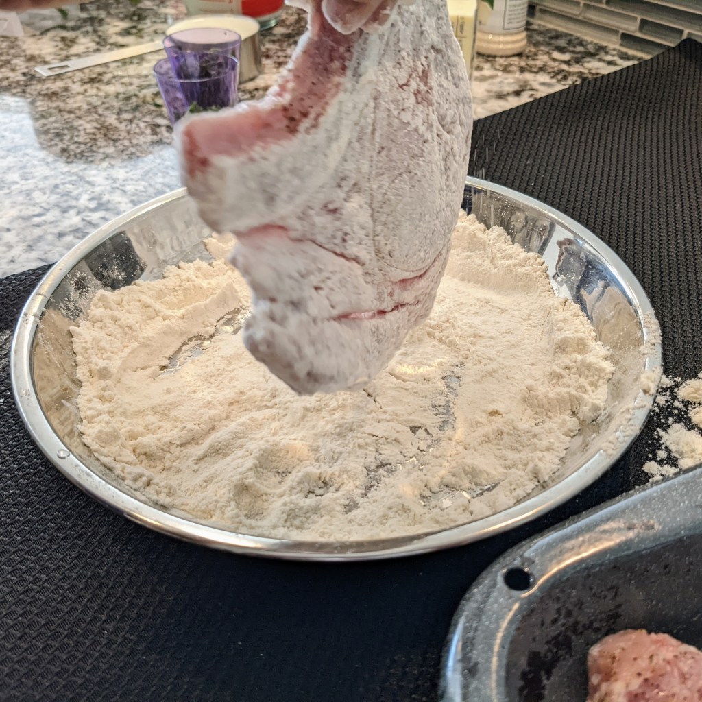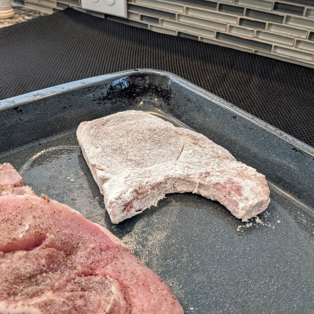 Place flour in a shallow bowl. Then, dredge each chop in flour and shake off the excess. Save the rest of the flour for later use.