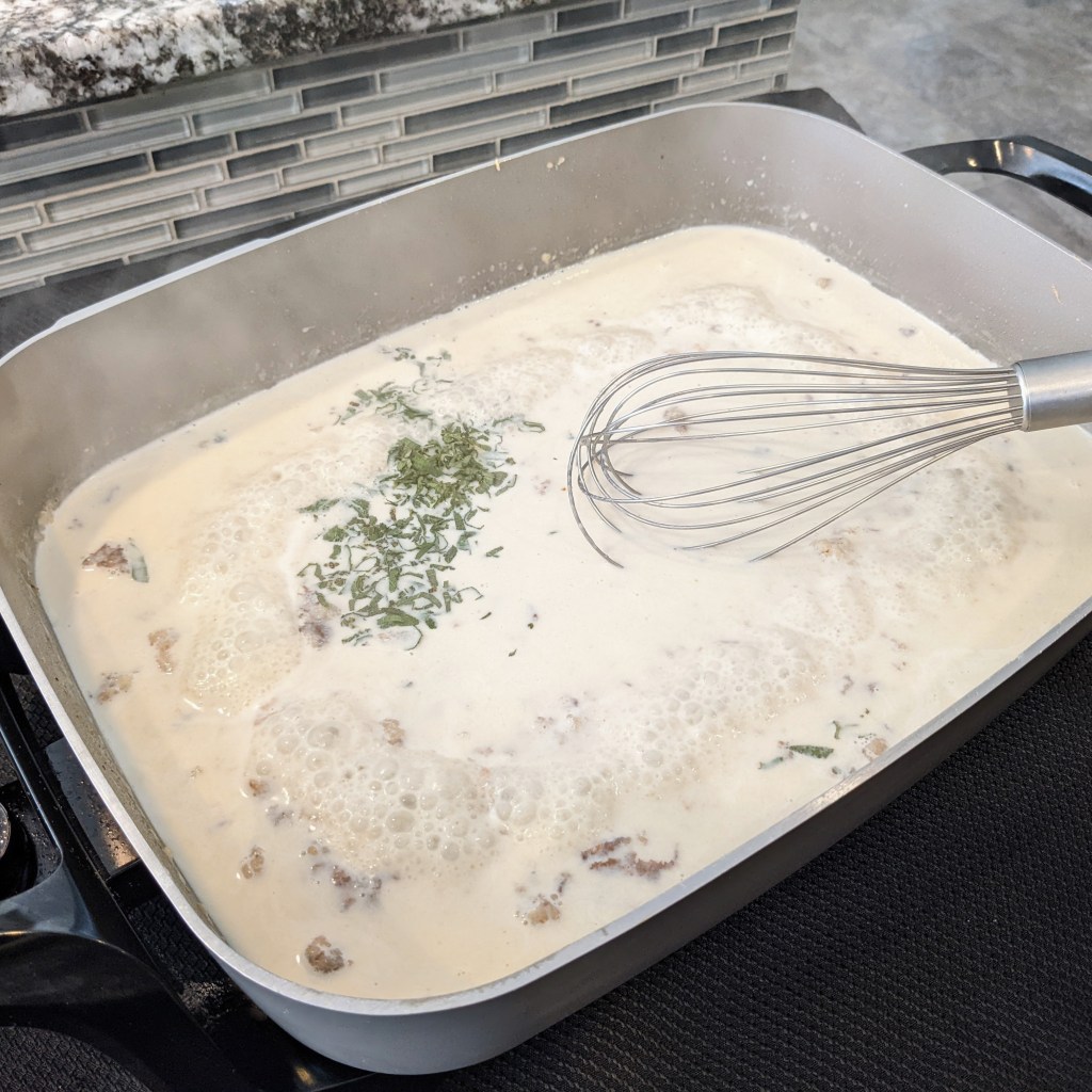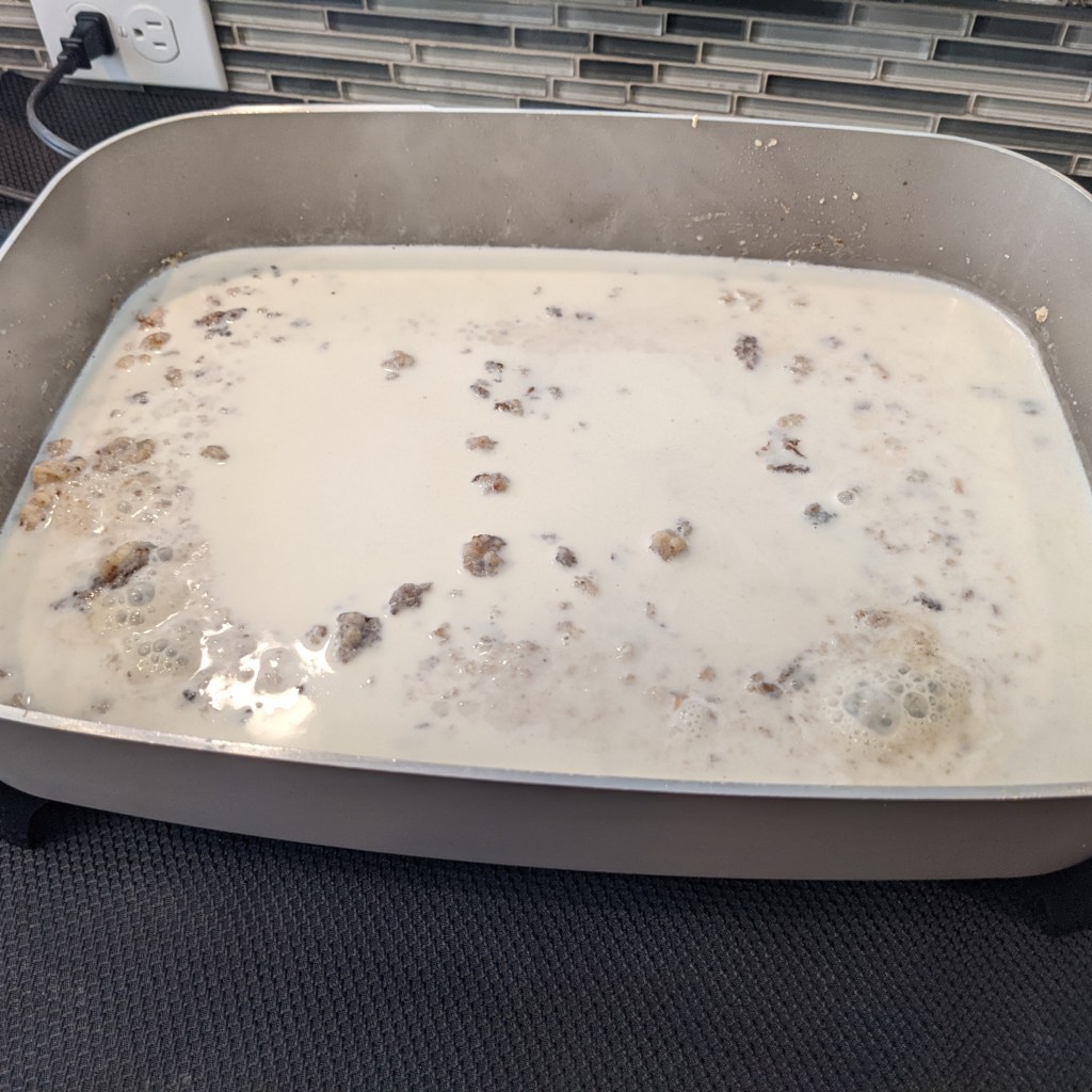Add milk and heavy cream. Whisk until the mixture is somewhat smooth. Cook, whisking occasionally, until gravy thickens.