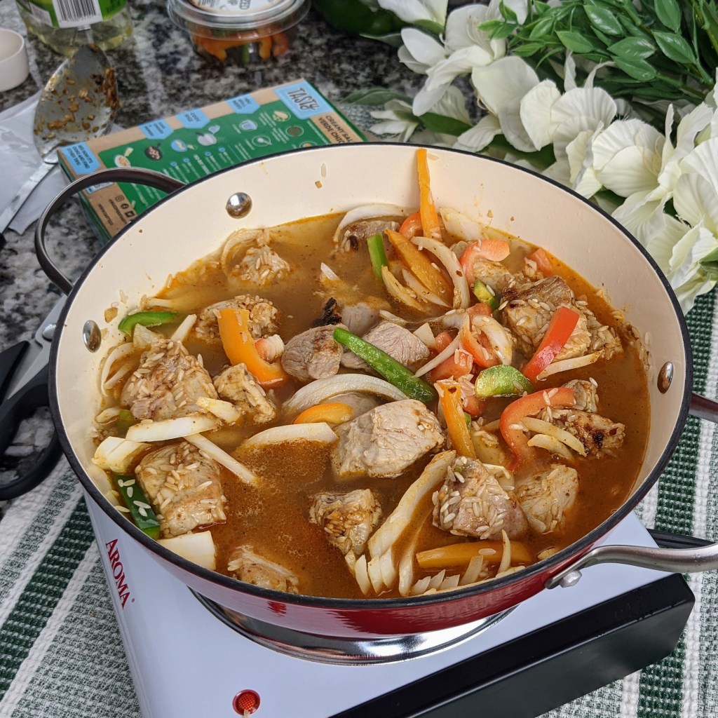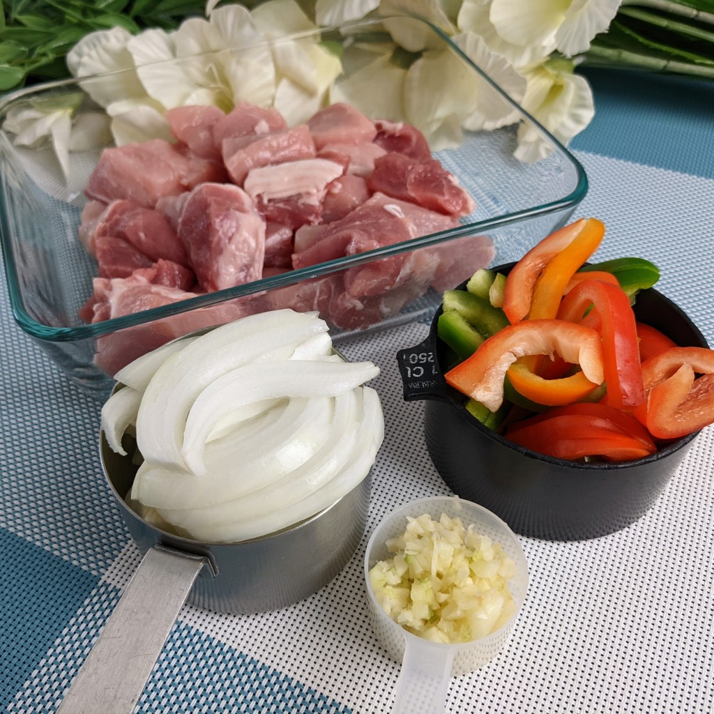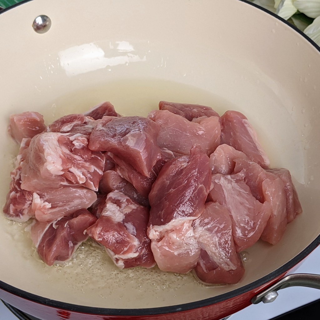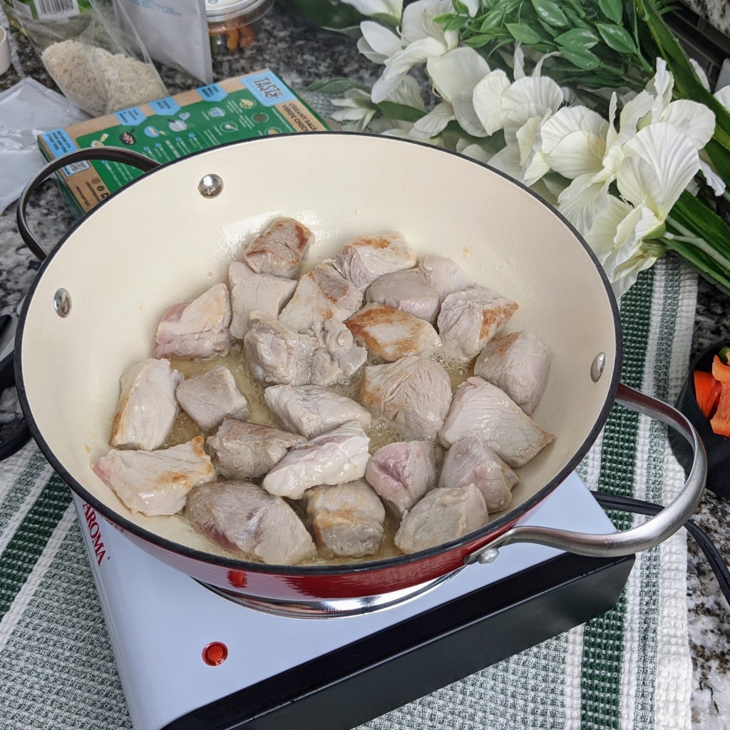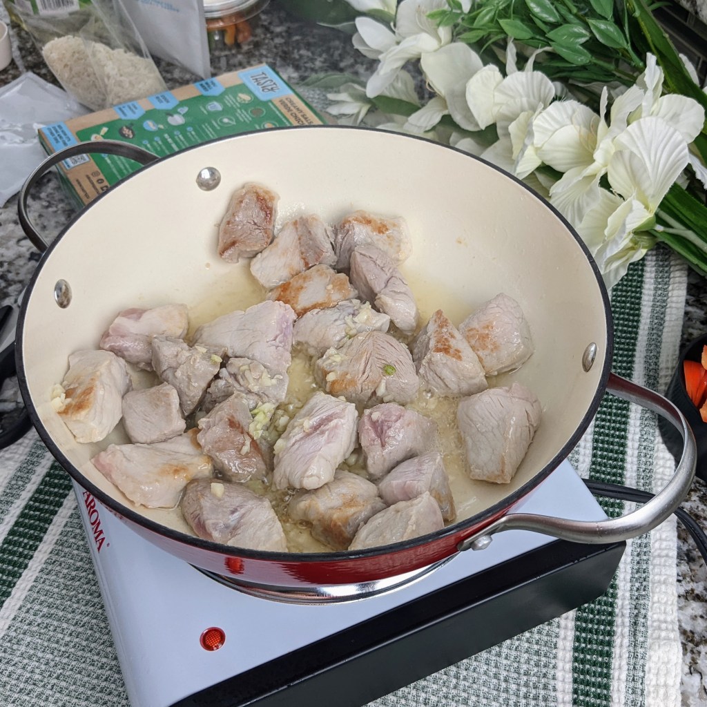 Prep meat and the veggies, then set aside until needed. Heat oil in a non-stick cooking pot over medium heat. Once the oil is hot, add the pork. Cook for 2 minutes without stirring. Then flip the pork pieces and cook for another 2 minutes.