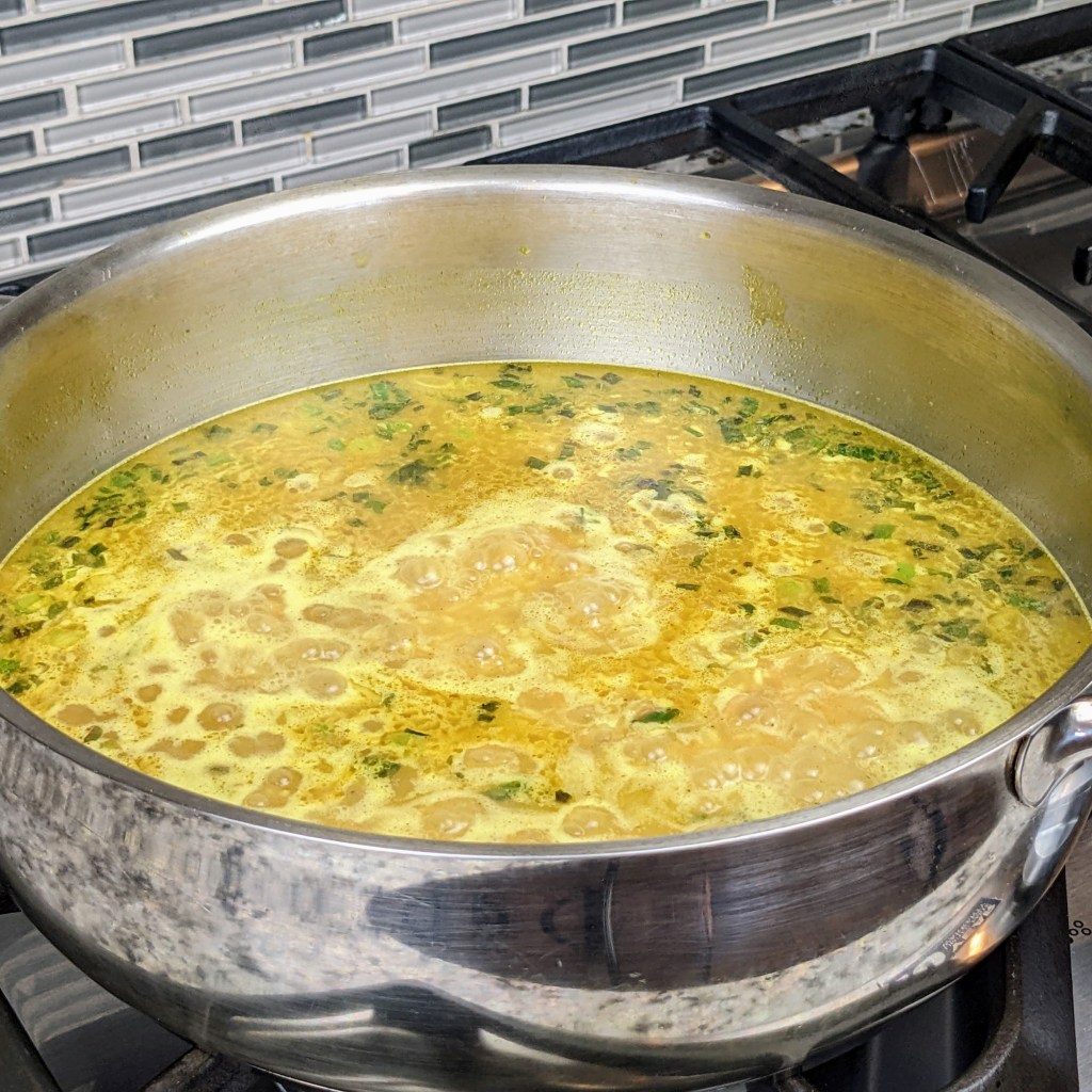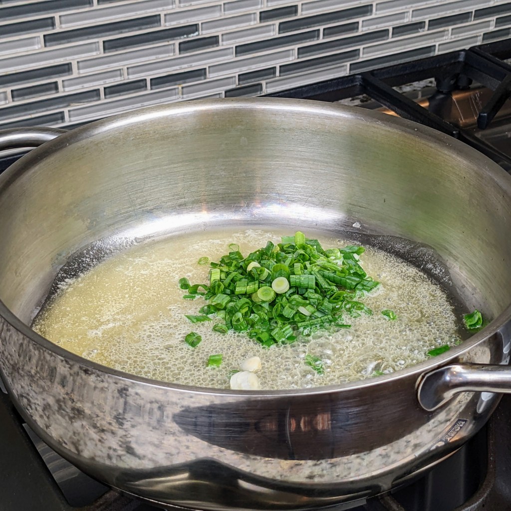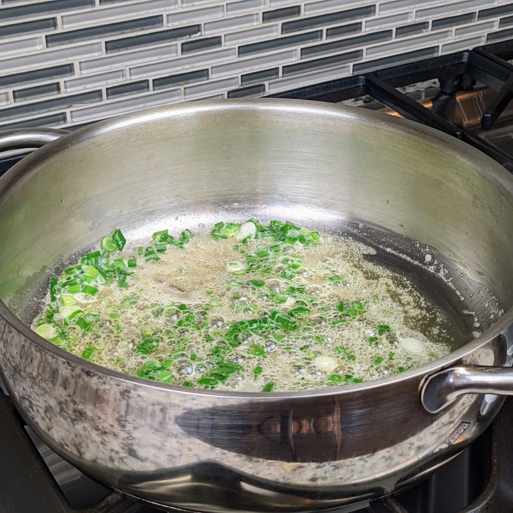 In a large heavy bottom saucepan, melt butter over medium-heat. Then add the green onions, sauté for 40-60 seconds.