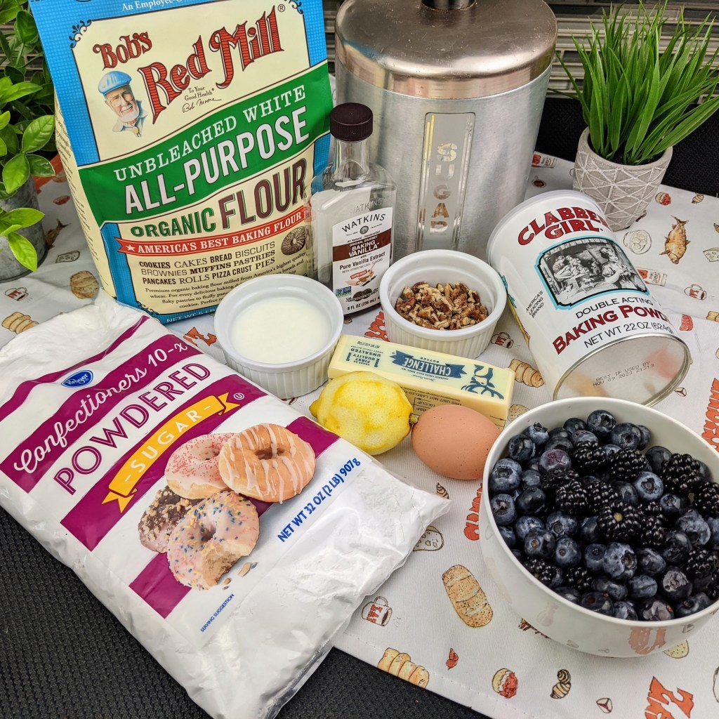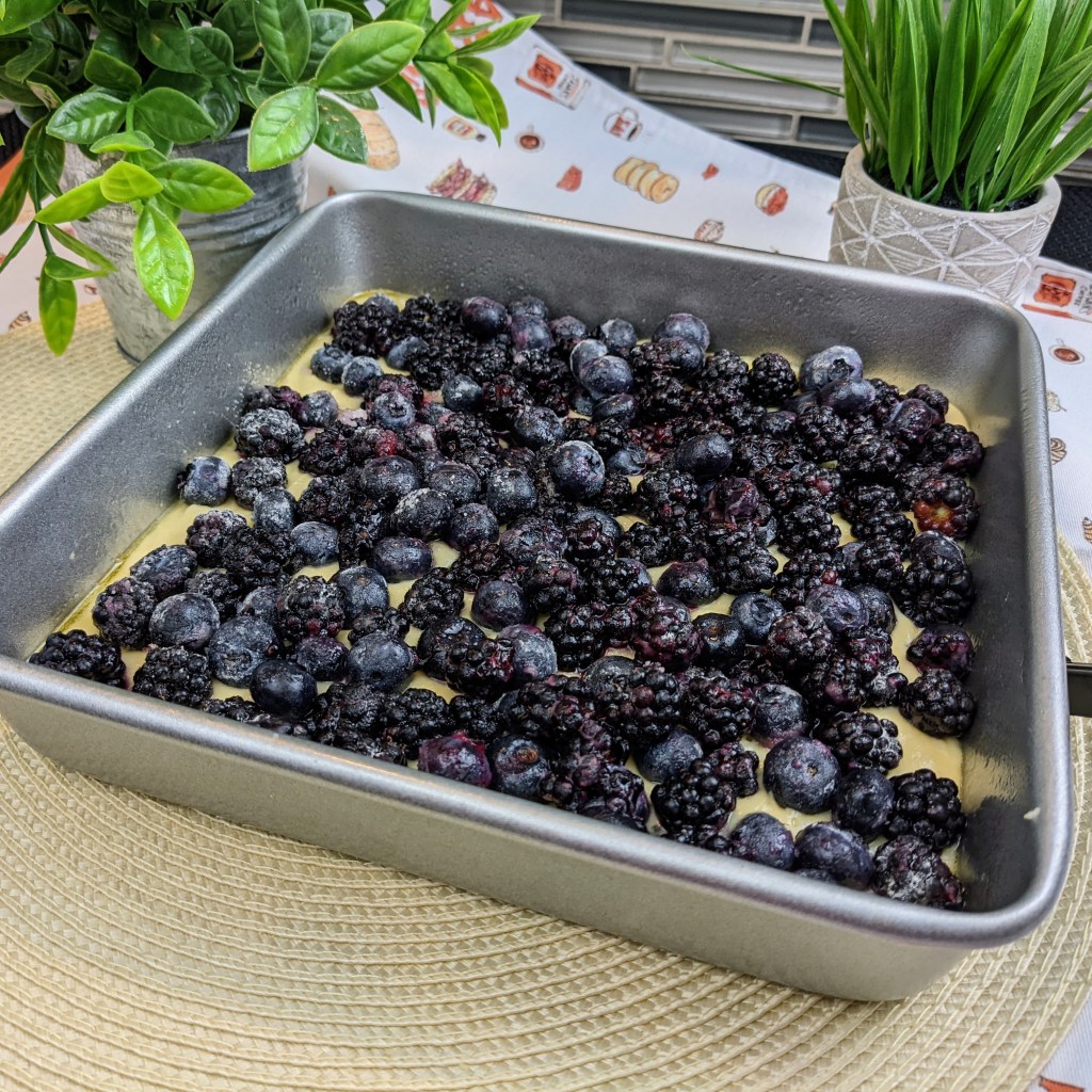 I have been very happy this summer with my garden. It’s been wonderful to get out in the morning to pick berries. We have several wild blackberry bushes that are producing a lot of big berries. My blueberry bushes are not as well established but still provided enough fruit this summer to let me make this delicious mixed berry coffee cake.