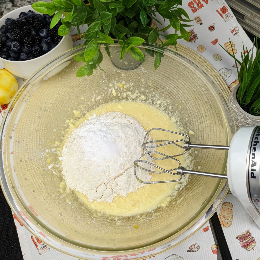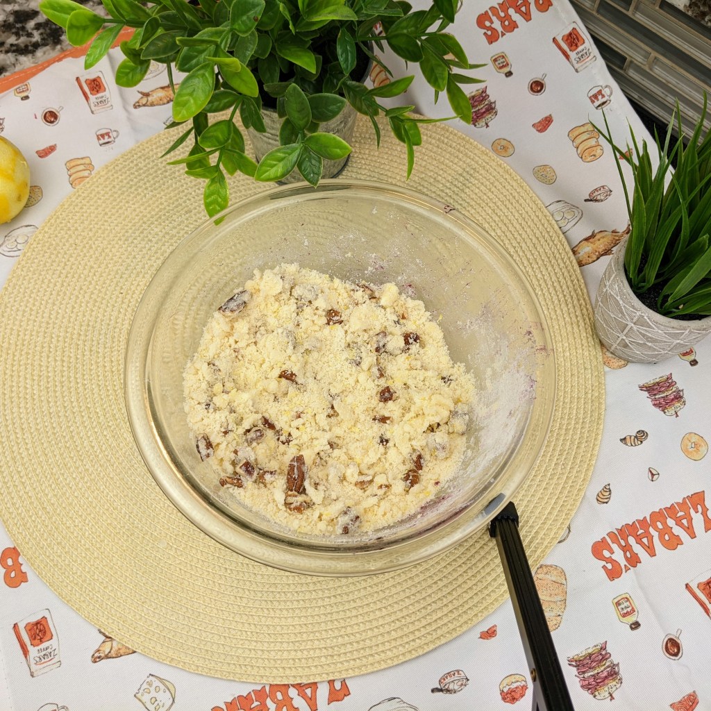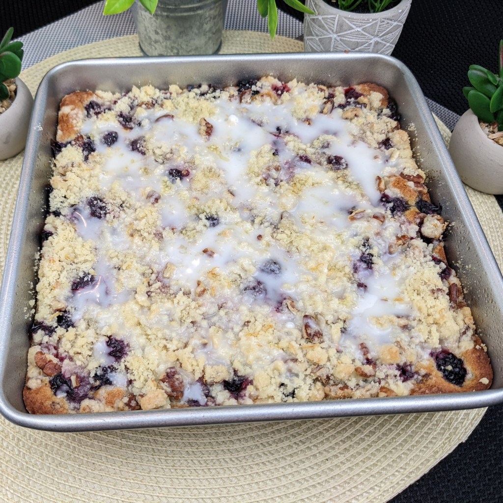 In this recipe I make a simple cake batter first, then add the berries. I then make a crumble topping which includes pecans for crunch and lemon zest for a touch of citrus flavor. Once the berry cake is done, I then finish with a lemon drizzle.