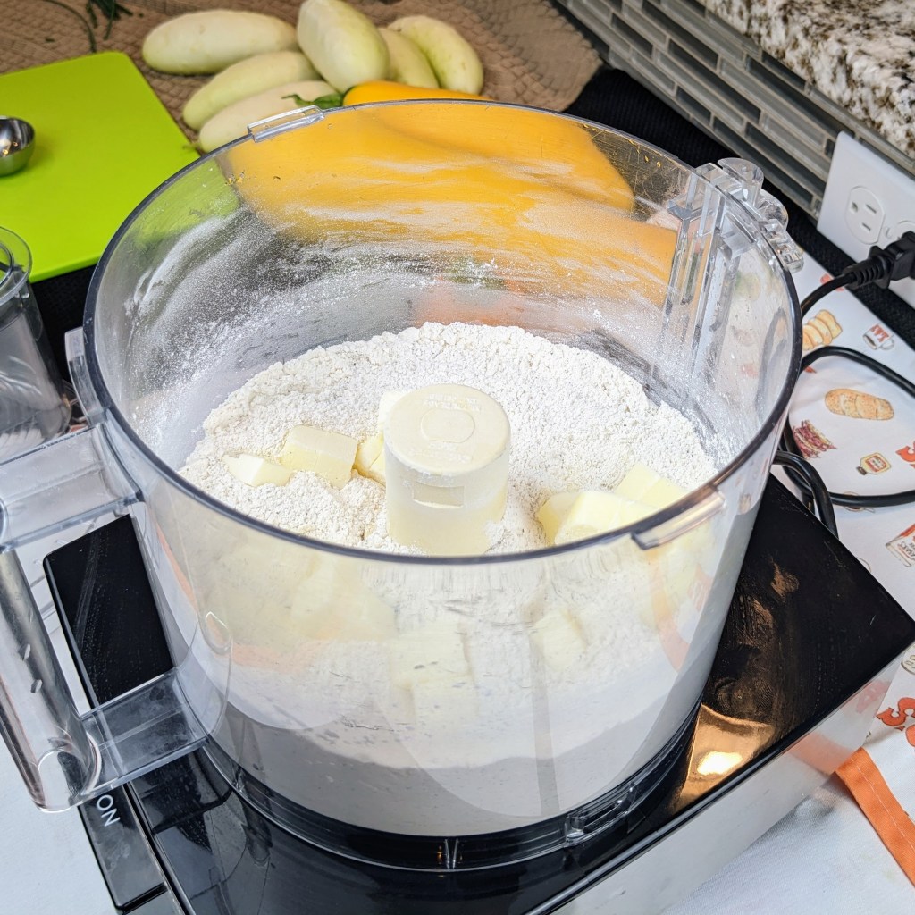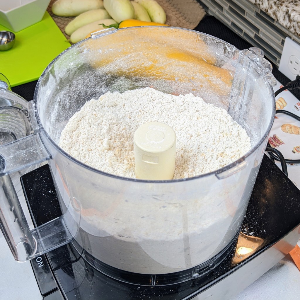 Combine flour, baking powder, soda, salt, pepper, and sugar in food processor. Blend for few seconds using pulse button.
