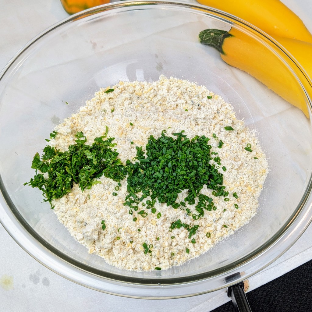 Add chives and parsley. Use a rubber spatula and fold everything gently. Add heavy cream and mix everything gently, until dough begins to come together in moist clumps.