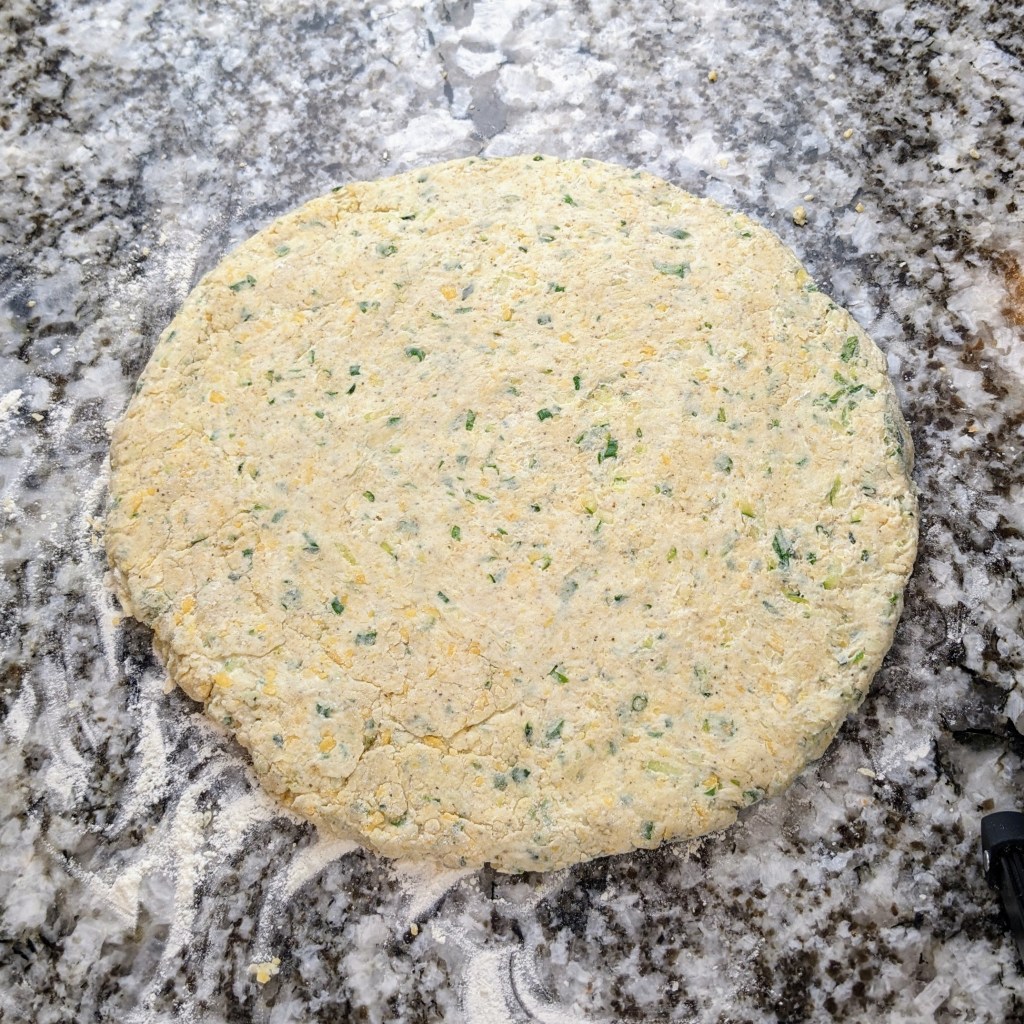 Transfer the mixture to lightly floured surface. Gather the dough in to a ball. Pat out to 6-8 inch round, about 1/2 inch thick.