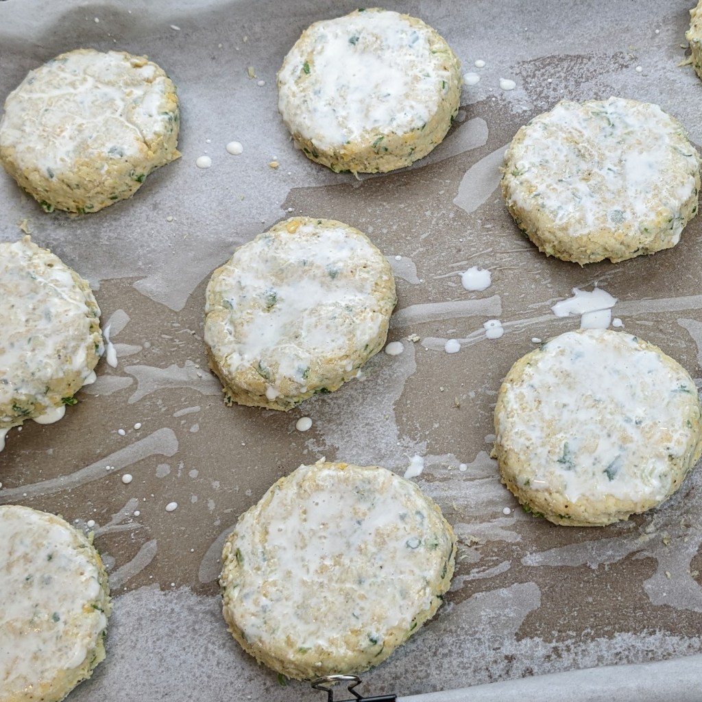 Place the biscuits about 2-inch apart on prepared sheet pan. Brush each biscuits top with heavy cream.