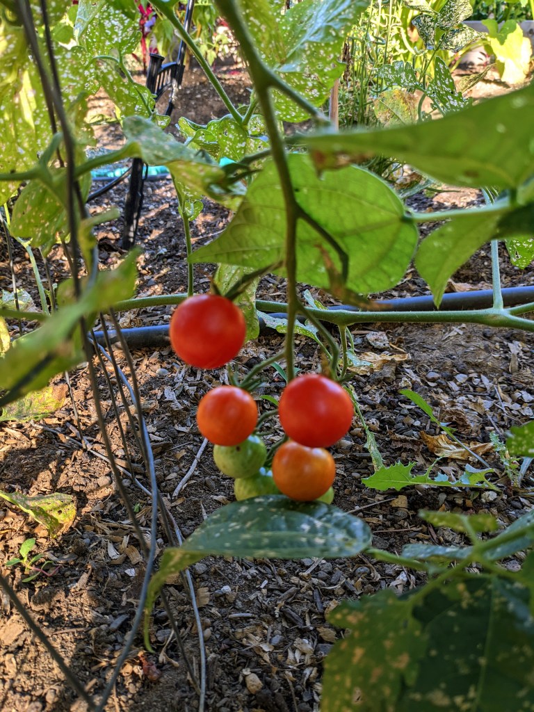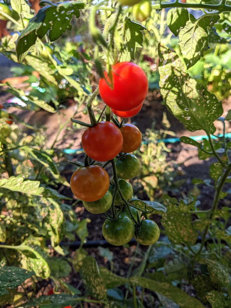 I was surprised when I discovered that all my tomato plants were little cherry tomatoes even though the tags said “heirloom.” Oh well, we have been enjoying eating them fresh and in salads.