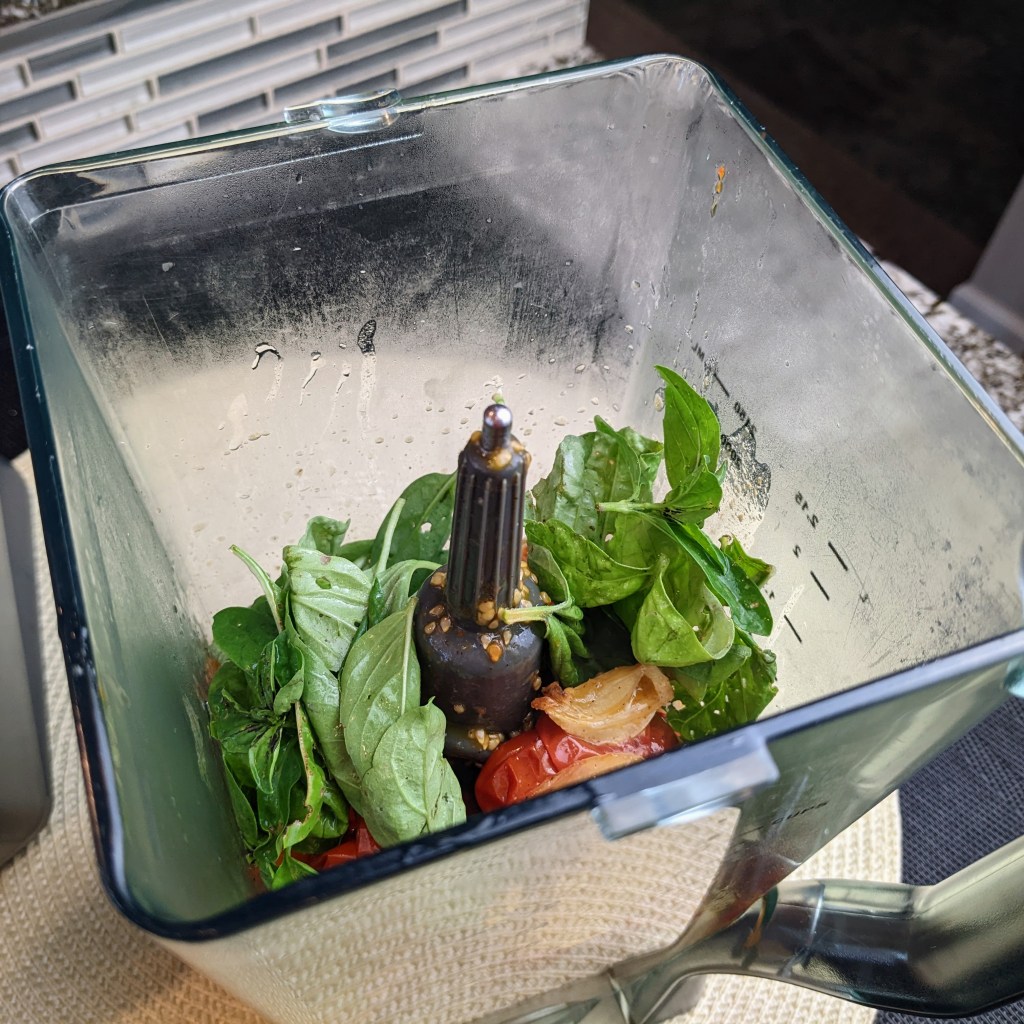 Once the tomatoes are done roasting, cool slightly. Then place it in a blender jar along with fresh basil. Puree until smooth.