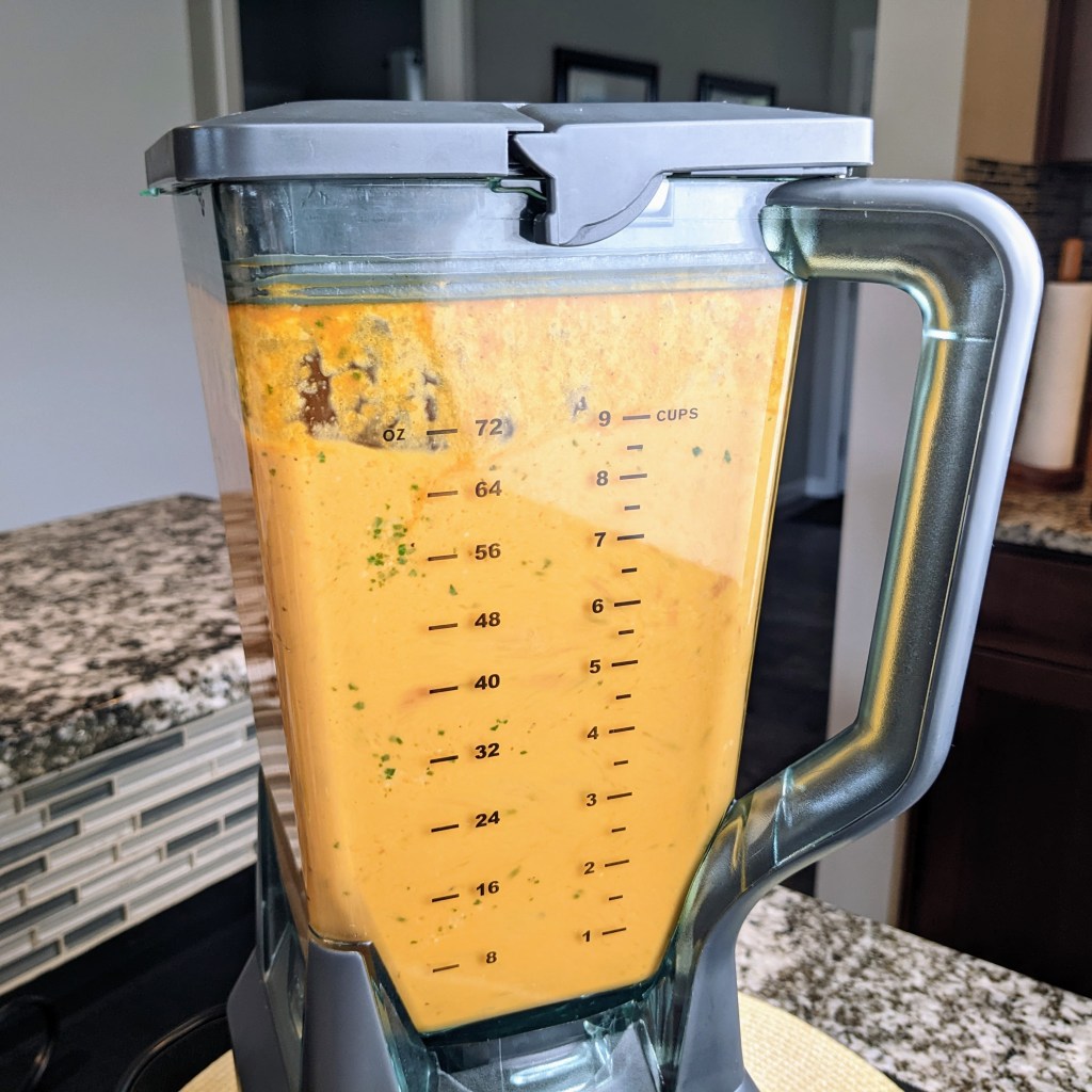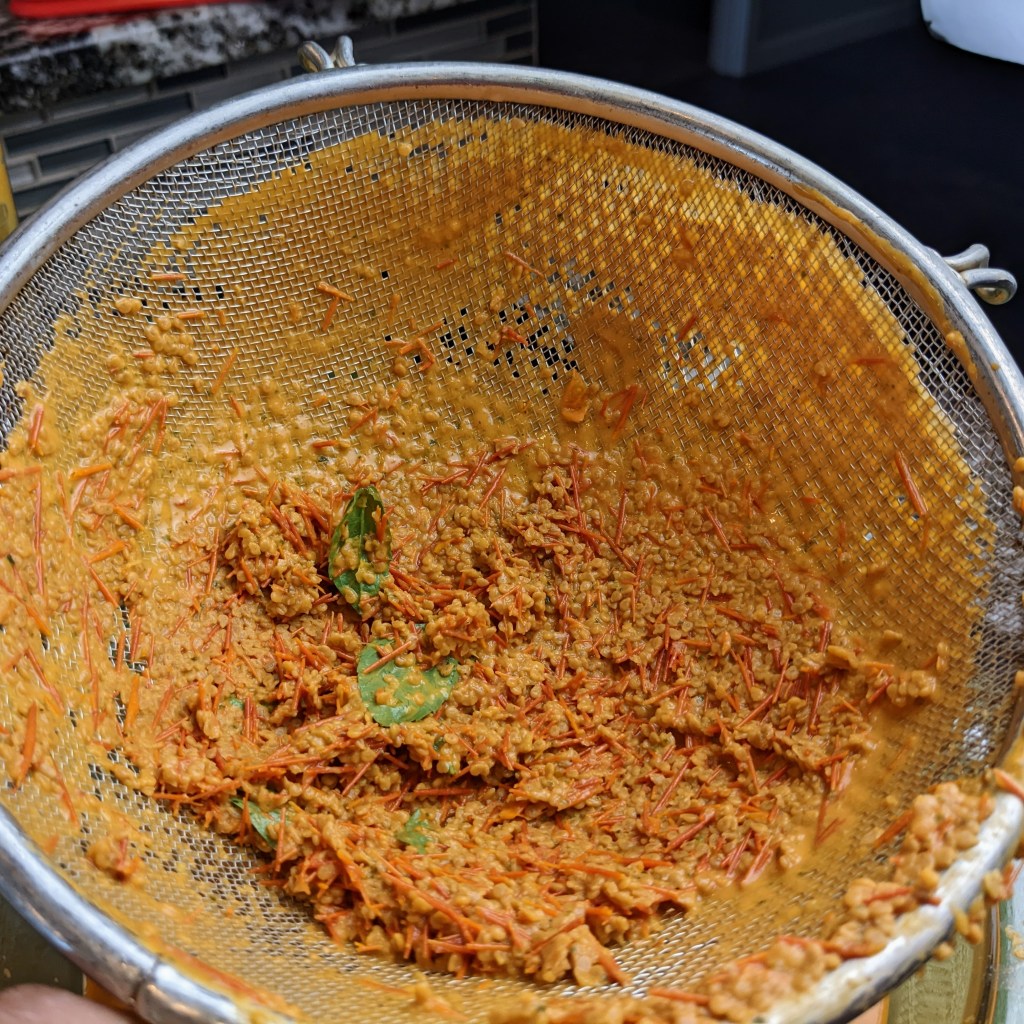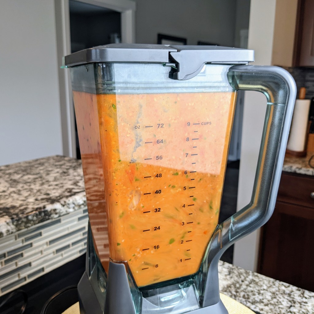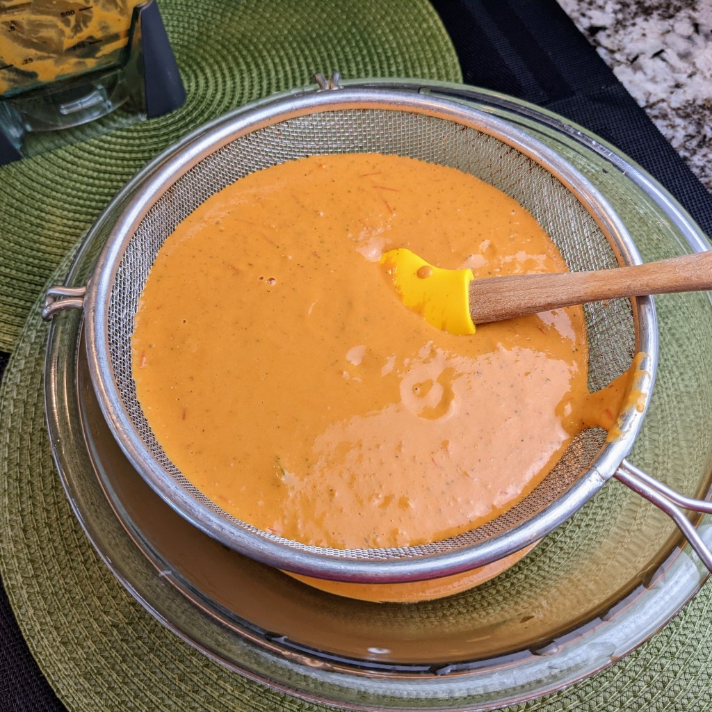 Strain the finished soup for smoother texture. Transfer to a heavy bottom pot, and warm up to serve or serve at room temp.