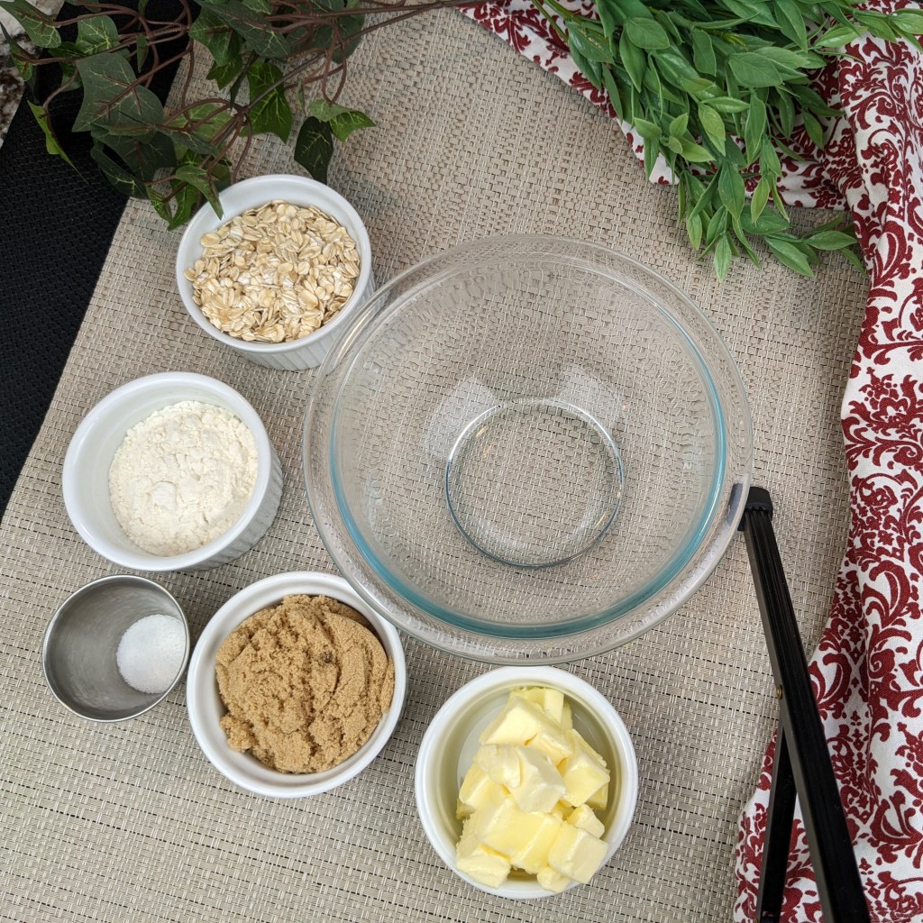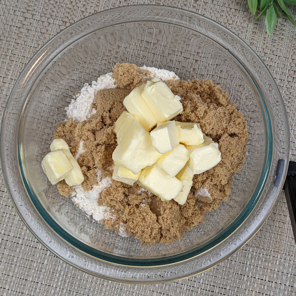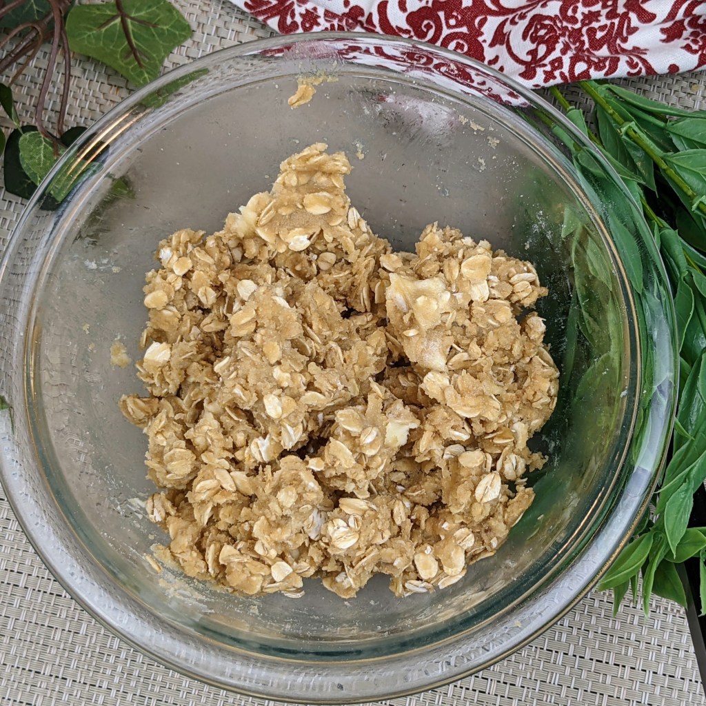 Place rolled oats, flour, brown sugar, salt, and cubed butter in a medium size bowl. Use your clean hand to rub the butter into the flour and oats mixture using your fingertips until it is well-mixed and doesn’t look dry.