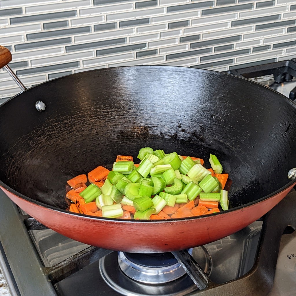 Next add the carrots, stir-fry for 3 minutes, then add celery, cook for another minute.