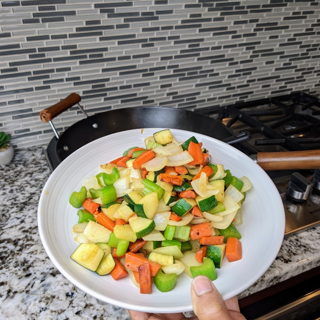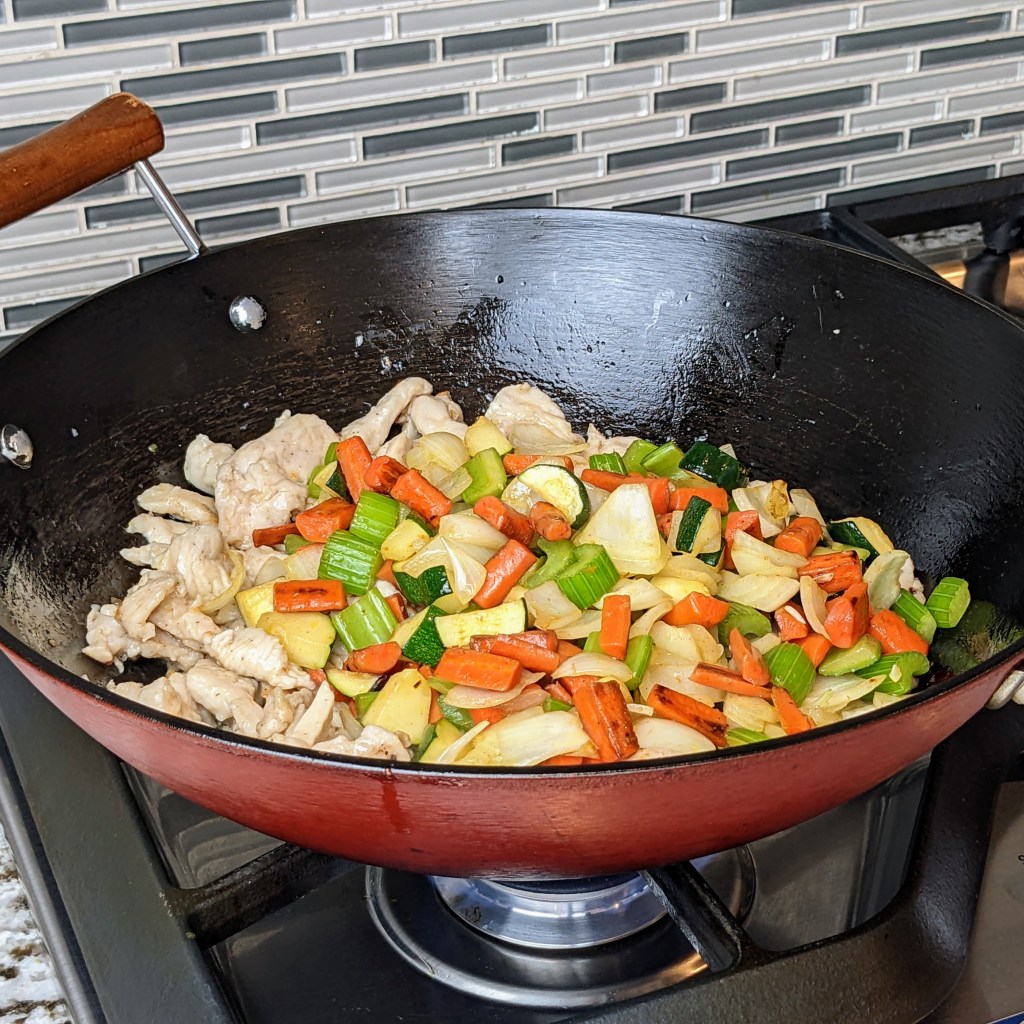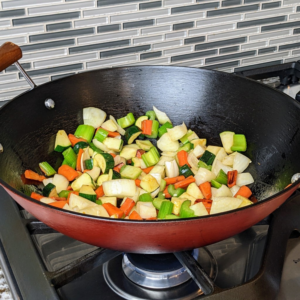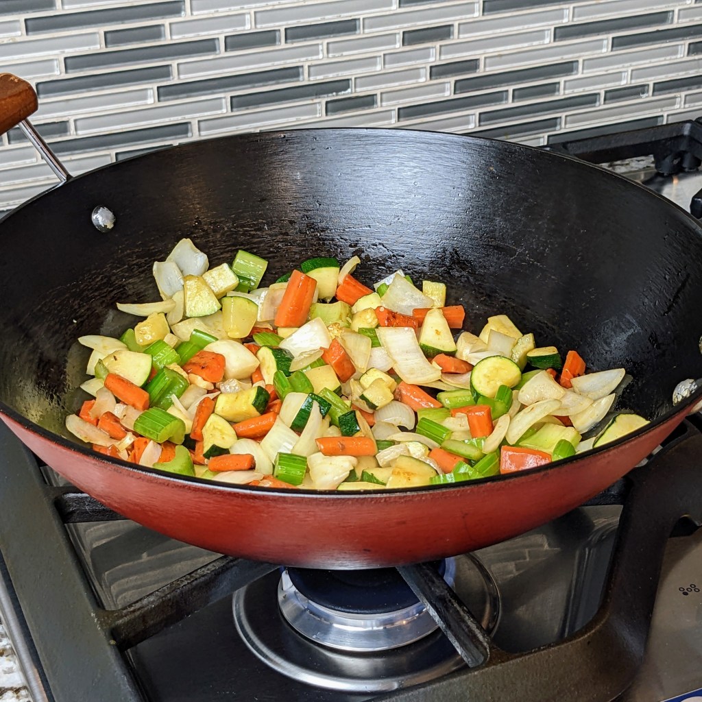 I like to load up my stir fries with a lot of veggies. Depending on what restaurant you go to, the vegetable selection can vary a lot. Our local restaurant used carrots, onion, zucchini, and celery. You can decide which veggies you like and make it your own.