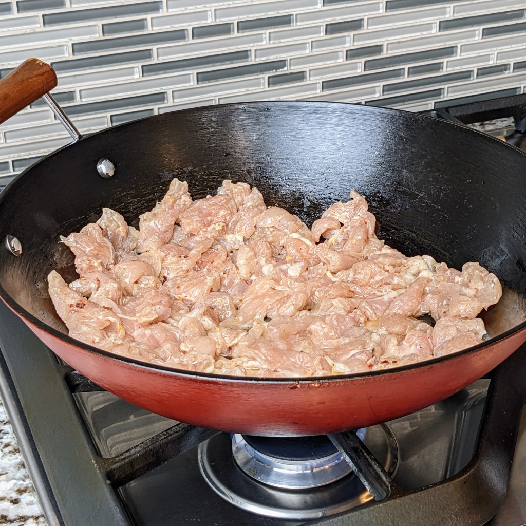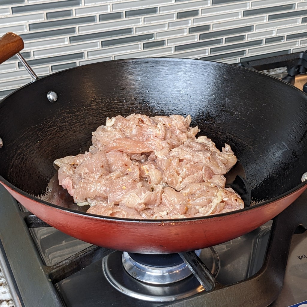 Turn the heat up medium low and add 3 tbsp. of oil. Add the marinaded chicken, and spread the chicken out as much as you can. Let the chicken cook for 2 minutes without stirring.
