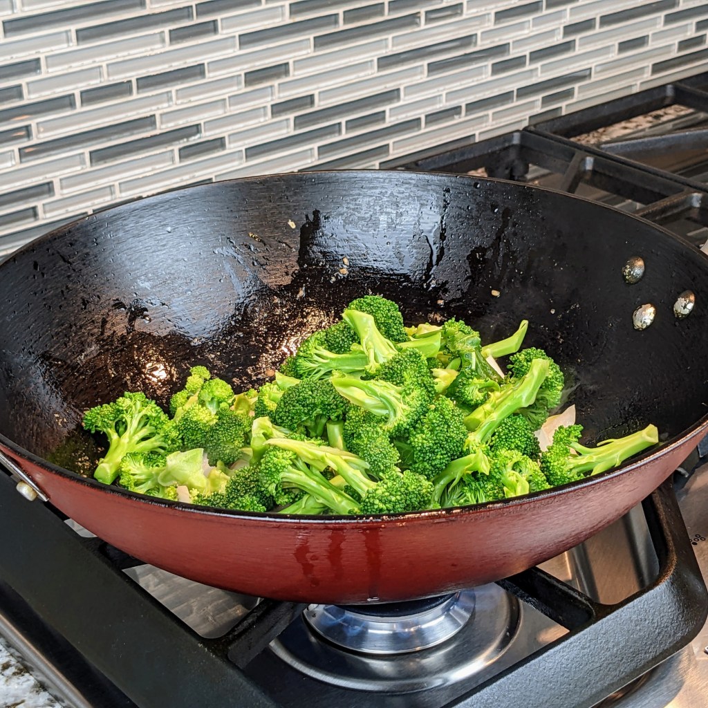 Add another tbsp. of oil to the wok and turn the heat up to medium-high. Add broccoli, and onion. Stir-fry for 3 minutes or until you see some color on the veggies.