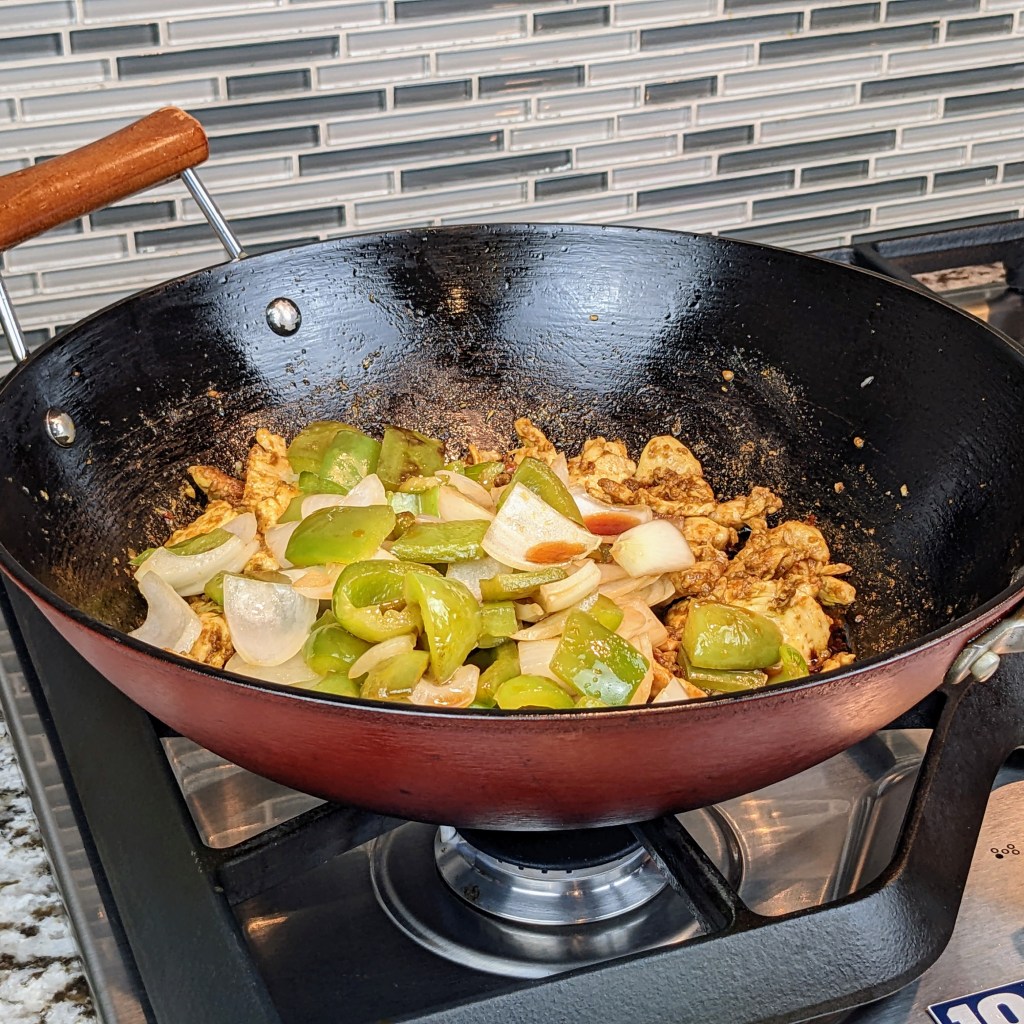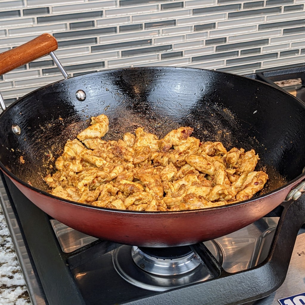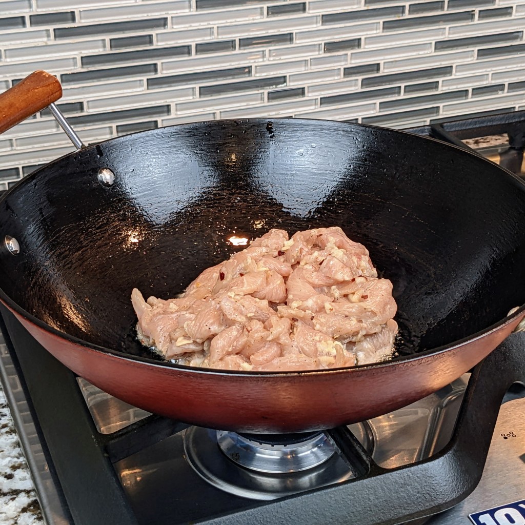 Turn the heat up to medium and add 4 tbsp. of oil. Add the marinaded chicken, and spread the chicken out as much as you can. Let the chicken cook for 2 minutes without stirring.