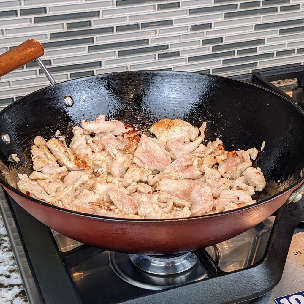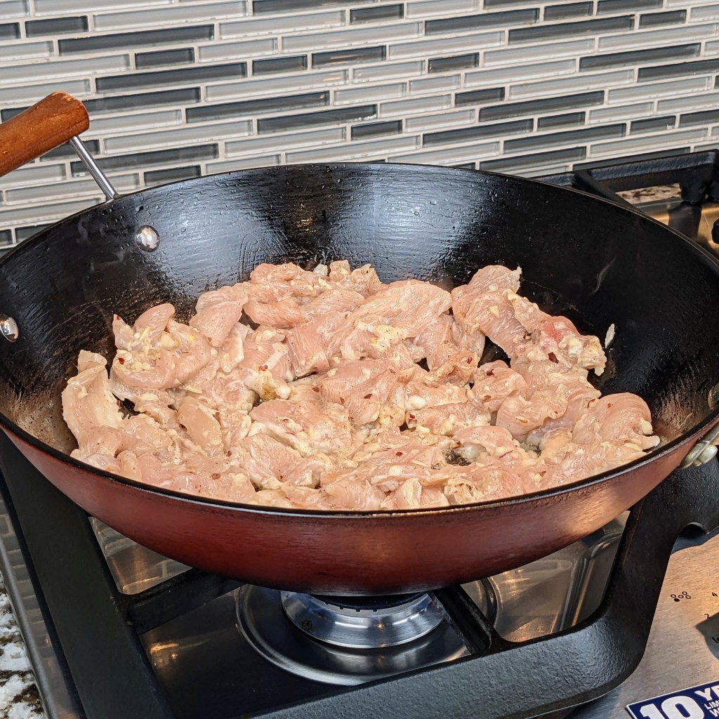 I like to use chicken breast most of the time when making stir fries because it cooks faster than thighs. I also like to marinate my chicken using a few ingredients beforehand so it produces tender and flavorful pieces of chicken.