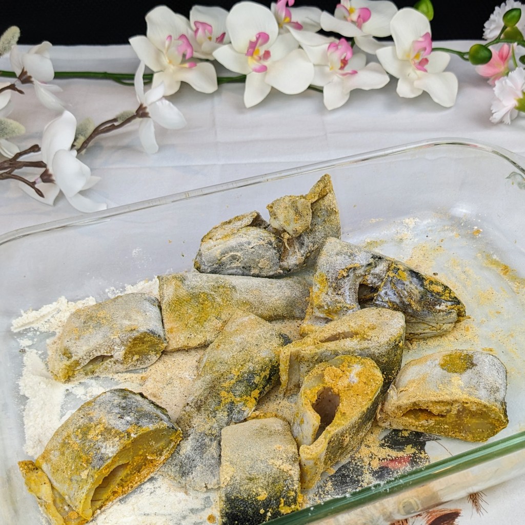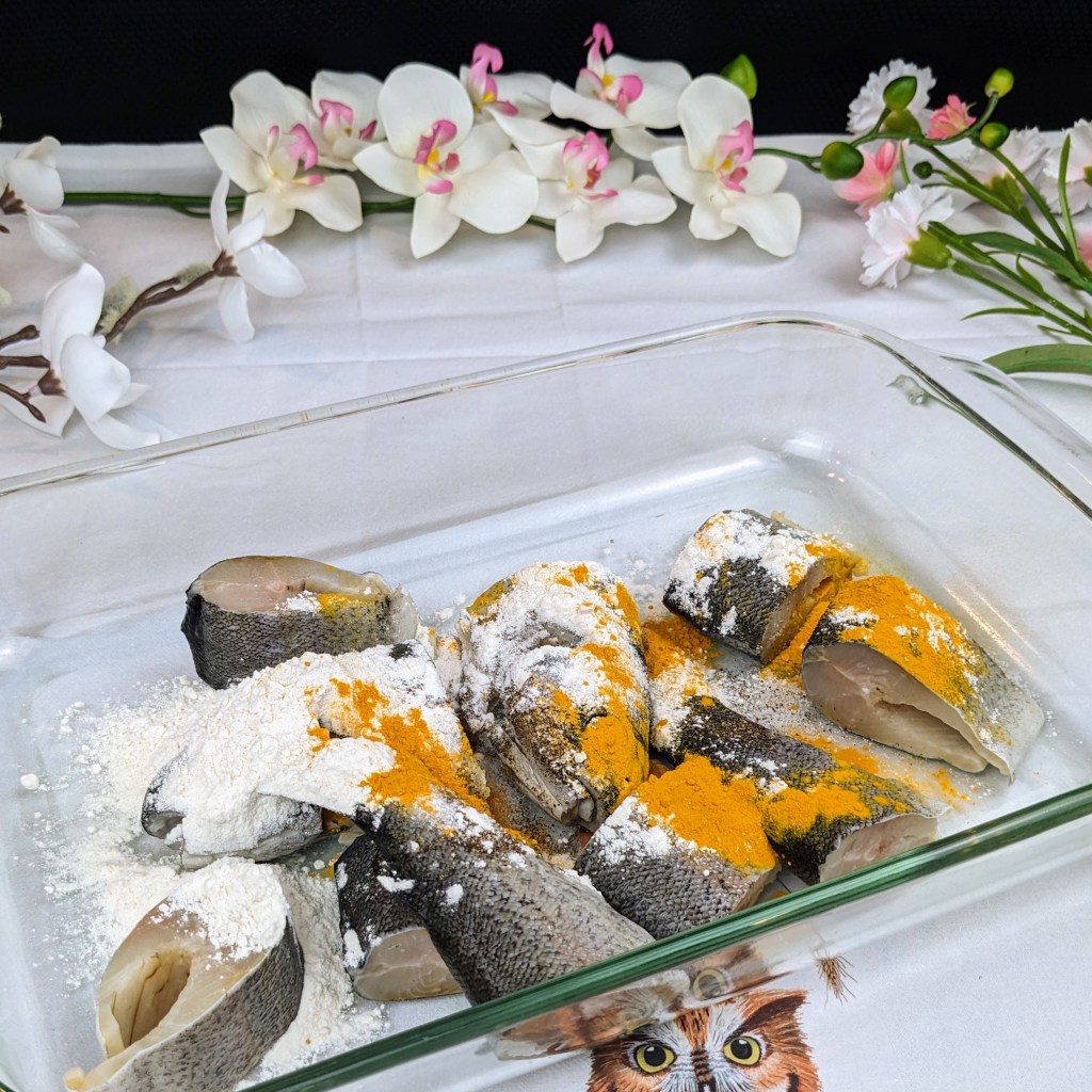 In a large shallow baking dish place fish, turmeric, pepper, salt, and flour. Coat the fish pieces with flour and spices well. Then set them aside until you are ready to fry the fish.