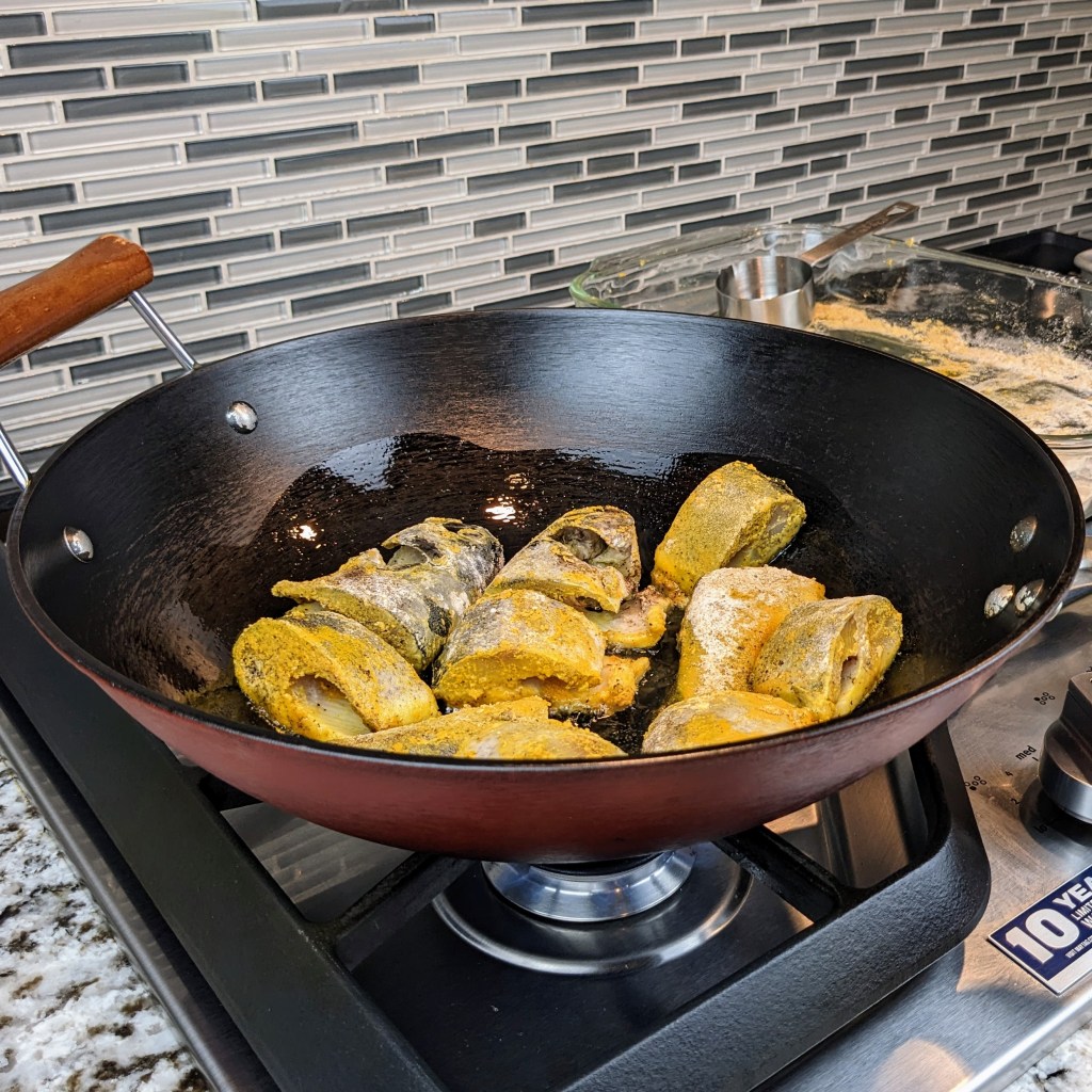 Things I do slightly different from traditional method is that I dredge the fish in flour when I season the fish. This keeps the fish from drying out and also helps thicken the gravy.