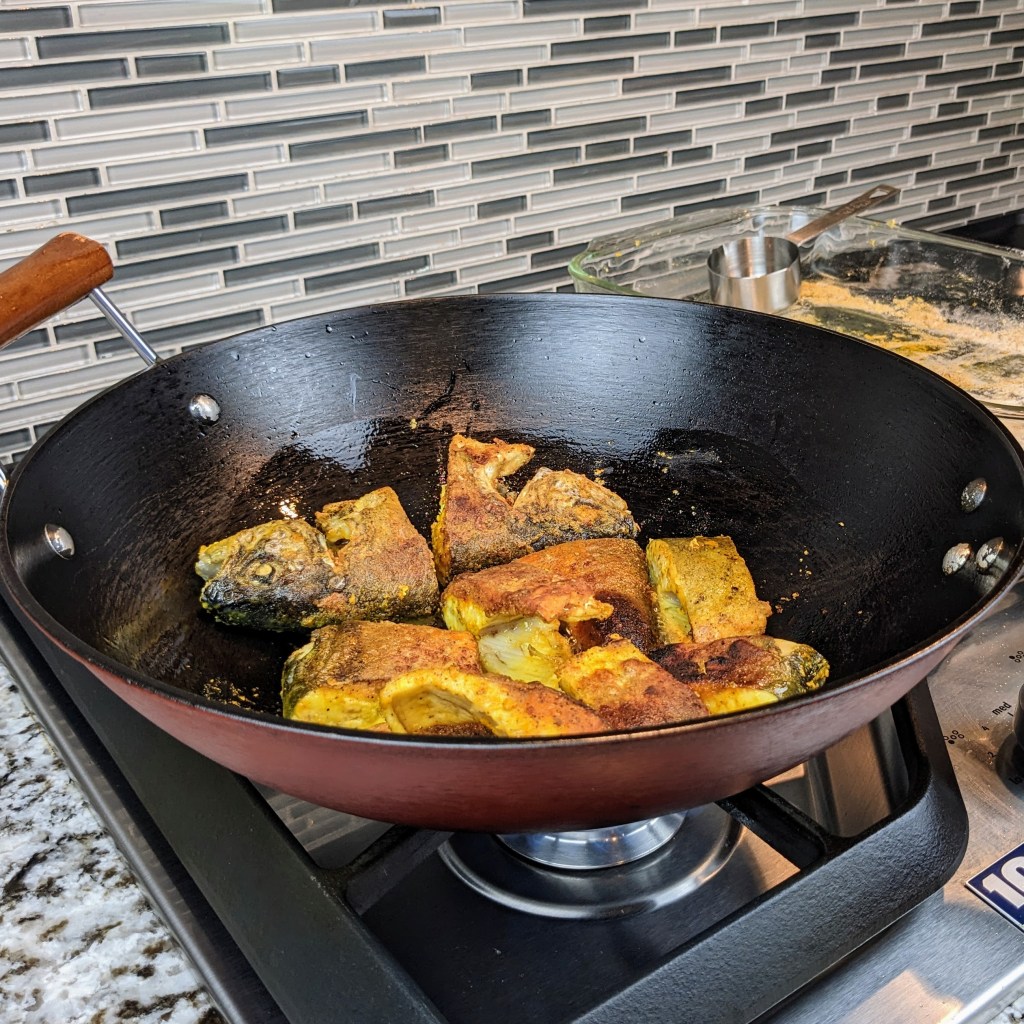 In a large non-stick wok or pan, heat oil over medium-heat. Once the oil is hot add fish pieces. Fry the fish without disturbing for 3-4 minutes in one side. Then flip the fish and fry for another 2-3 minutes on the other side, or until pieces are golden brown. Turn down the heat to very low.