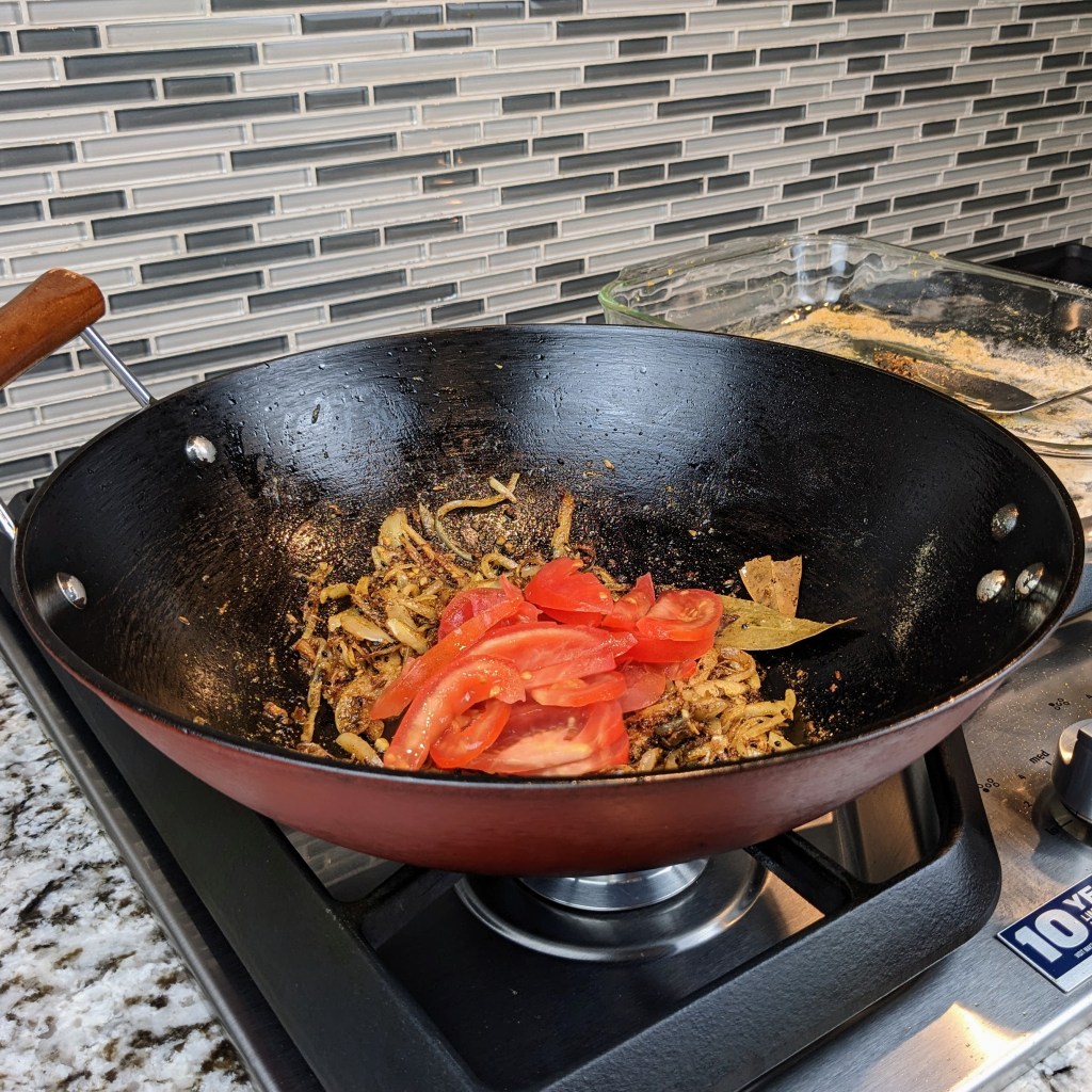 Next add tomatoes, stir well, and cook for 5 minutes, breaking up the tomatoes as you stir few times during 5 minutes of cooking.