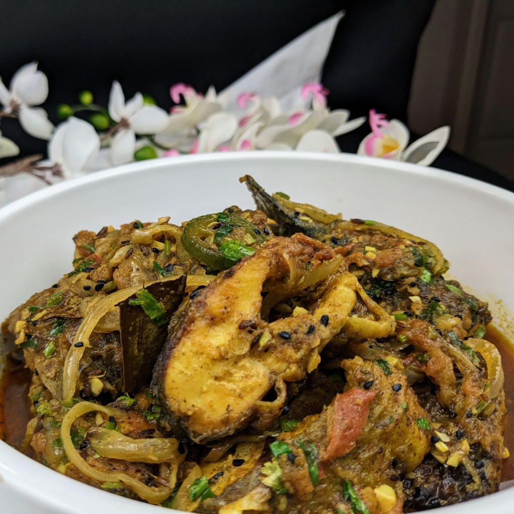 Today I am sharing my Machher jhol (মাছের ঝোল) Bengali recipe using trout. This is a traditional spicy fish curry in Bengali cuisines eaten in most households. The recipe varies with the household. In my family we first season the fish with turmeric, salt, and pepper. Then we fry the fish, so the fish holds its shape. The fried fish is then simmered in a flavorful gravy made of onion, ginger, garlic and other spices. Potatoes are added in some cases. Tomatoes are also an essential part of the dish as this adds a reddish color which is preferred by most people in Bengal.