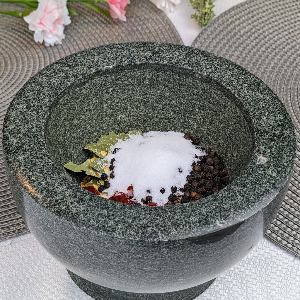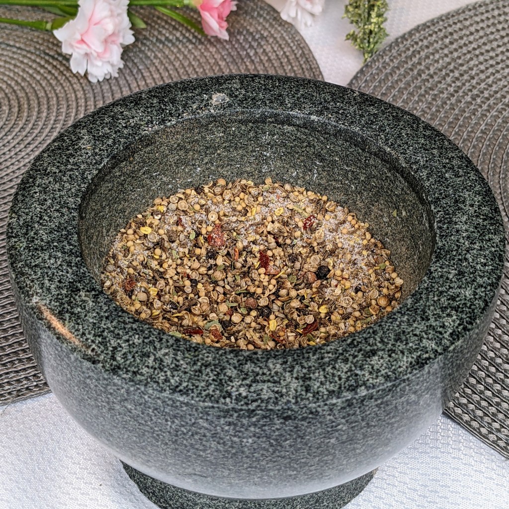 Then hold the mortar with one hand and with the other hand take the pestle and twist. Evenly grind, bash or crush all of the spices. Continue until the spices are crushed into coarsely ground. Set the spices aside until needed.