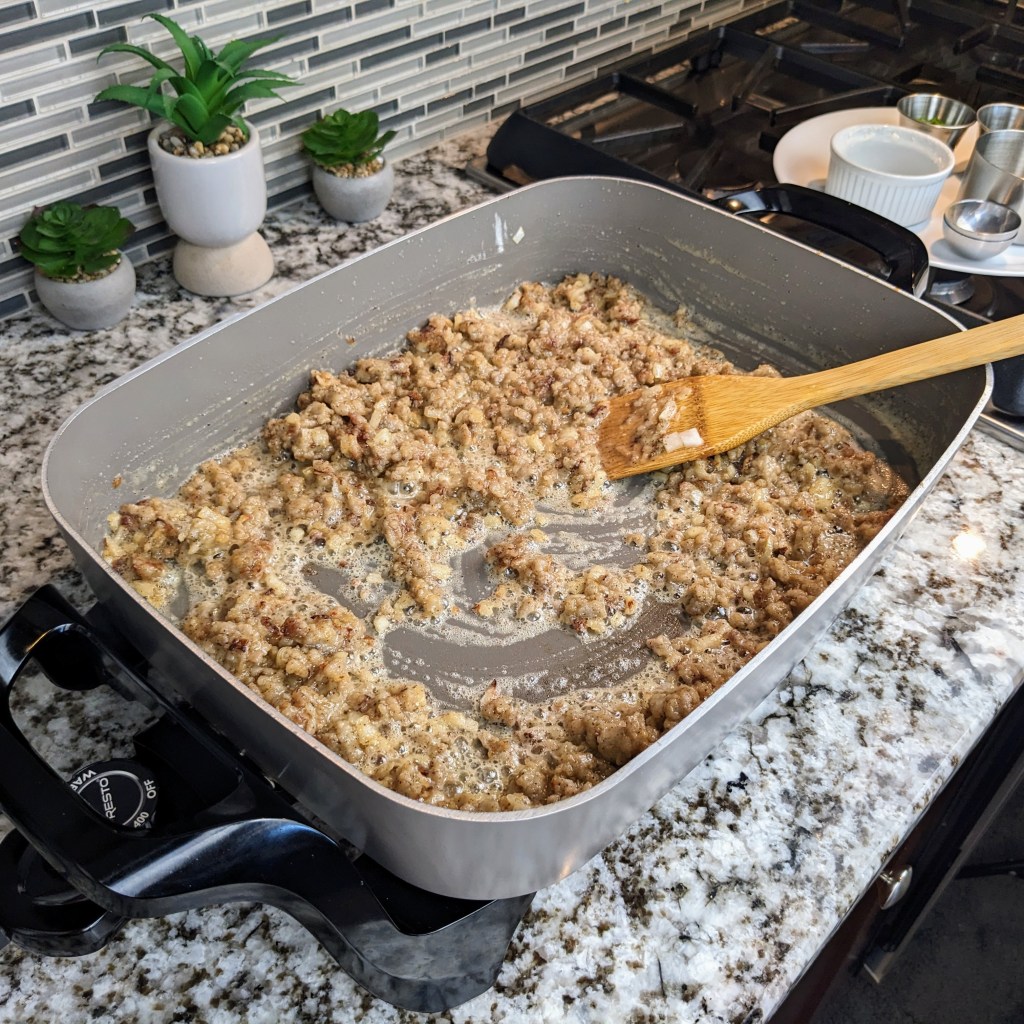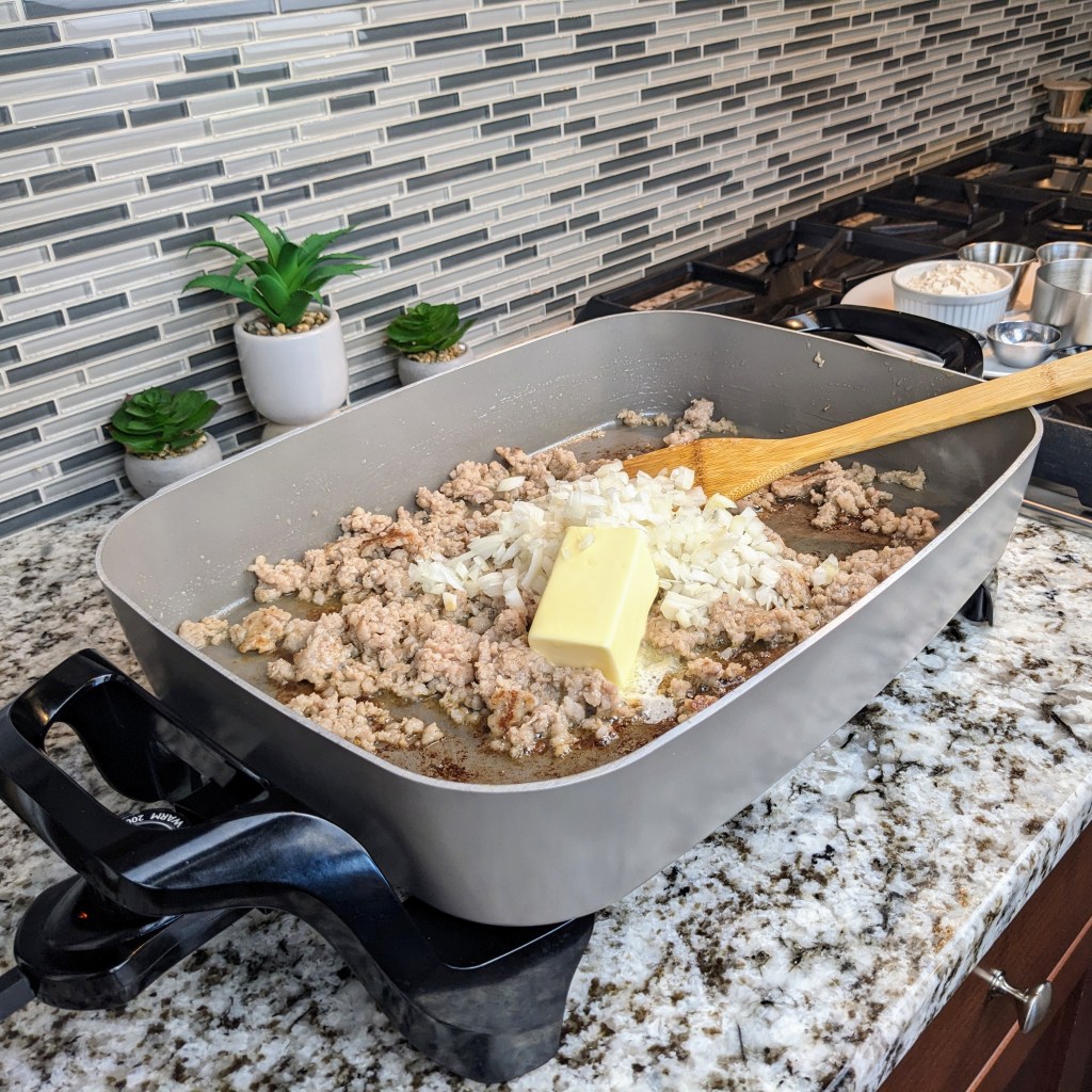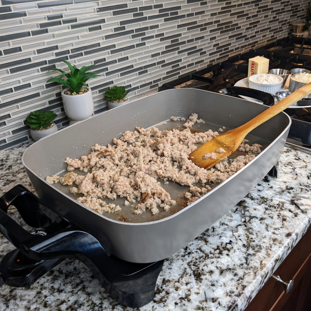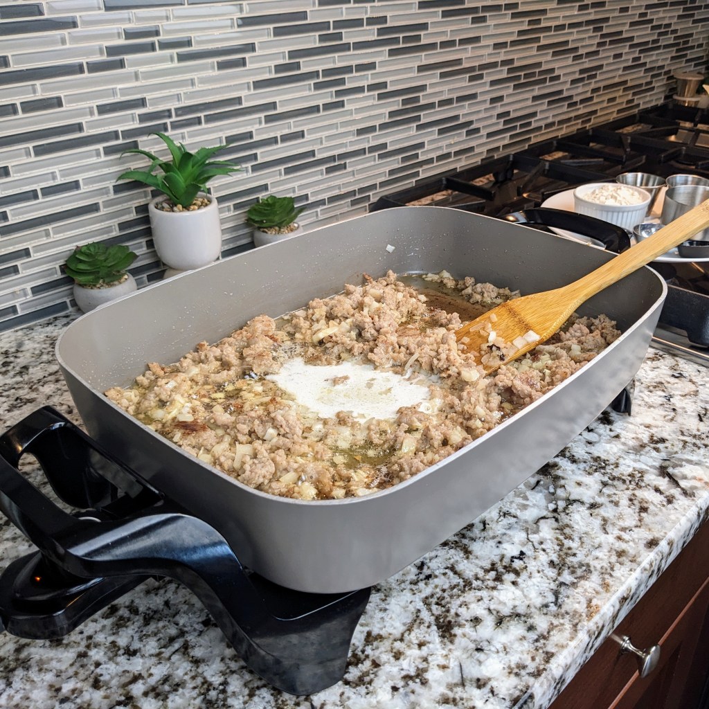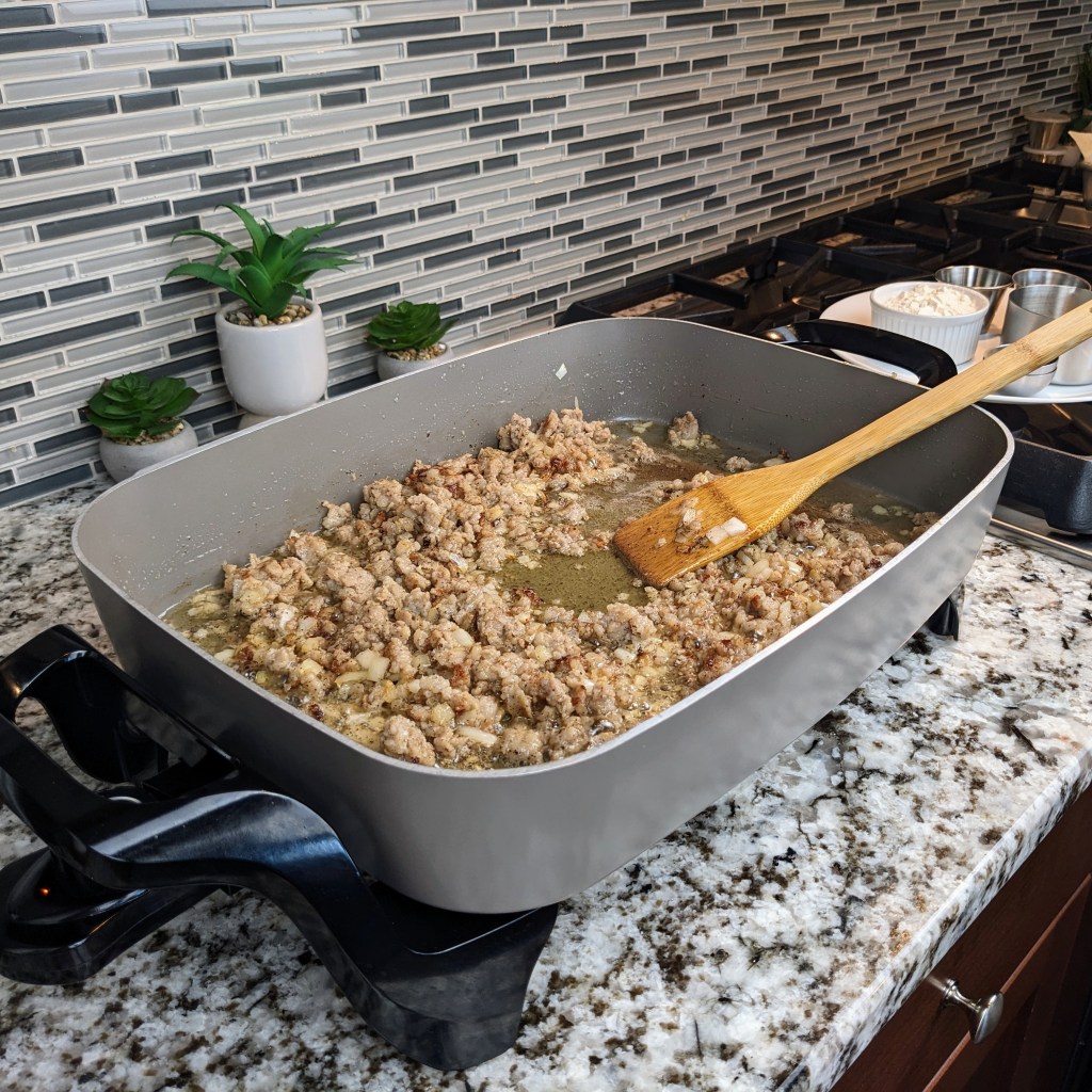 In the meantime, heat a large electric skillet over medium-heat. Then, brown the sausage for 3 minutes.